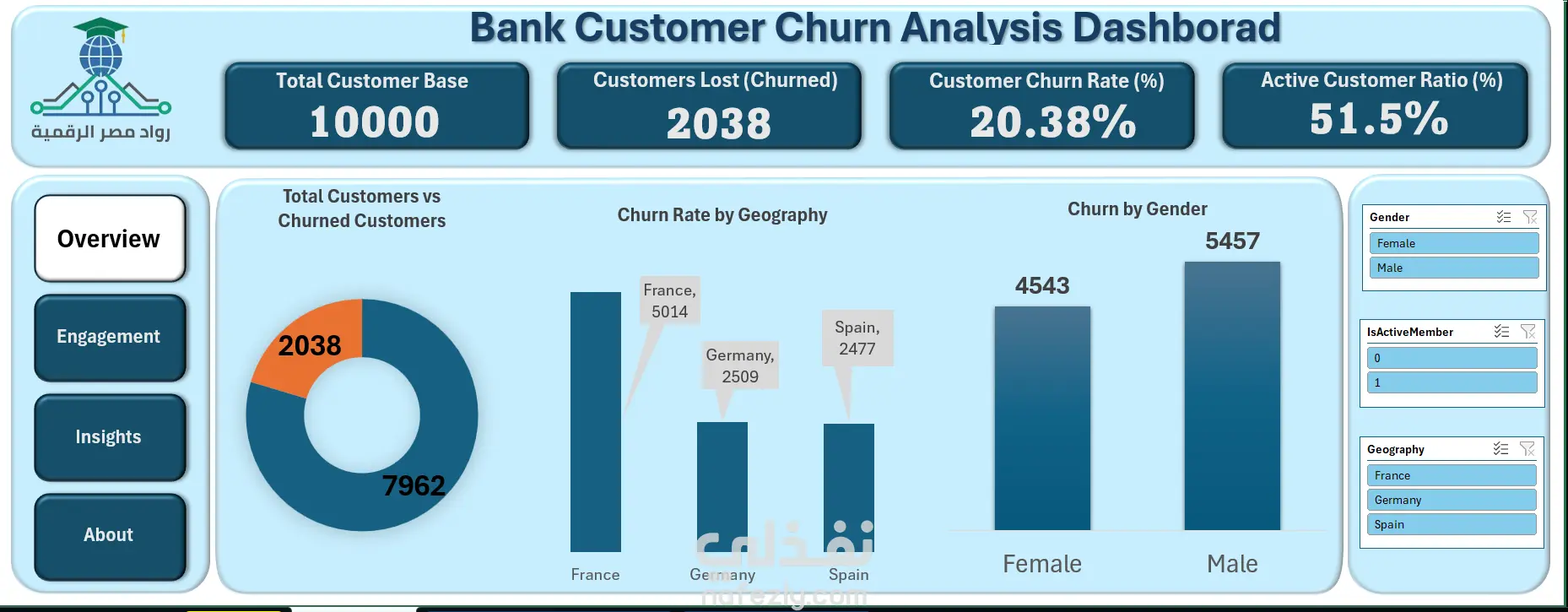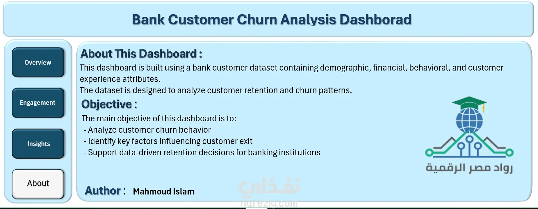 قمتُ بتصميم Dashboard تفاعلية باستخدام Microsoft Excel لتحليل تسرب عملاء أحد البنوك، بهدف فهم أسباب مغادرة العملاء ودعم اتخاذ القرار القائم على البيانات.