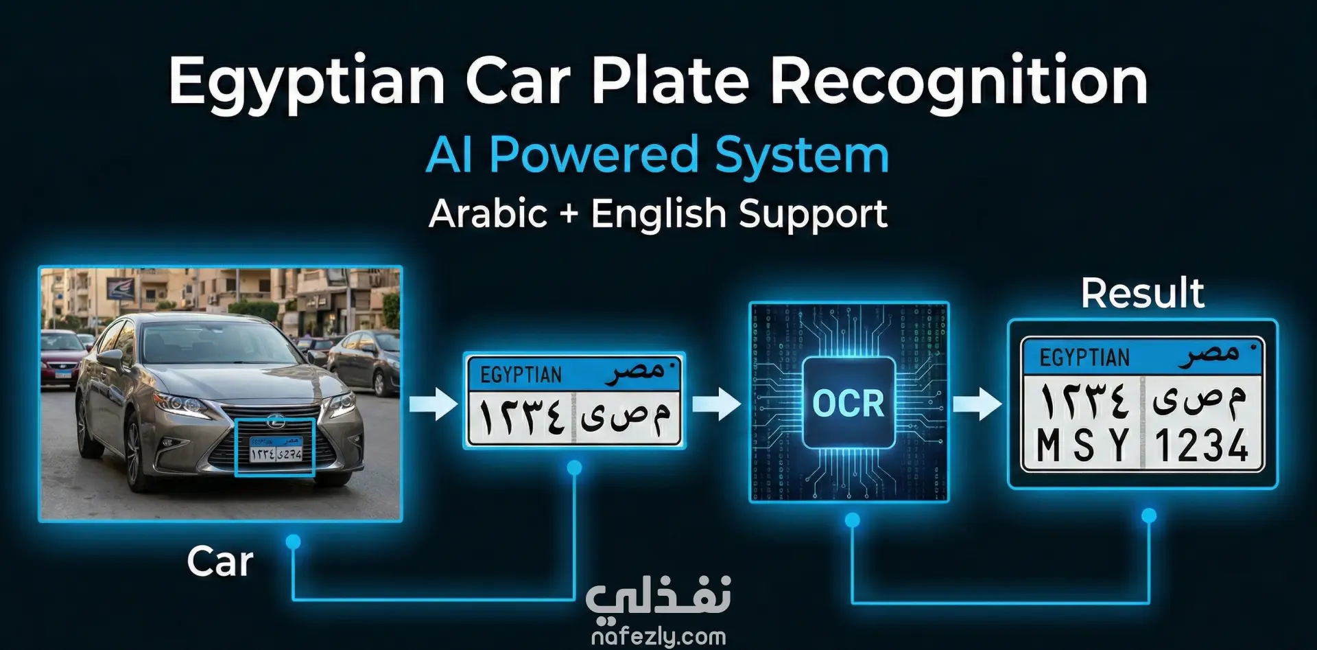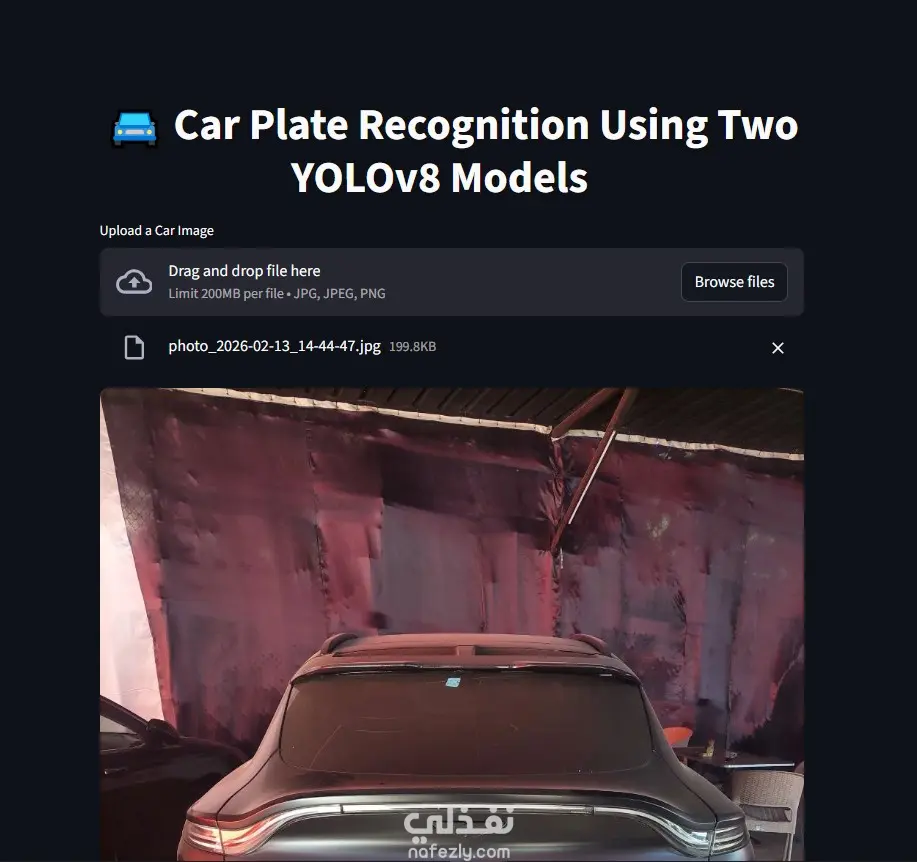 Egyptian Car Plate Recognition System نظام ذكي للتعرّف على لوحات السيارات المصرية باستخدام Machine Learning وComputer Vision، يدعم الأحرف العربية والإنجليزية والأرقام العربية الشرقية. يعتمد المشروع على: YOLOv8 لاكتشاف موقع لوحة السيارة بدقة EasyOCR للتعرّف على النص مع معالجة لاحقة لتحسين النتائج يتميّز النظام بالسرعة، سهولة الاستخدام، وإمكانية النشر كـ Web Application باستخدام Streamlit، مع قابلية الدمج في أنظمة المرور، المواقف الذكية، وأنظمة المراقبة.