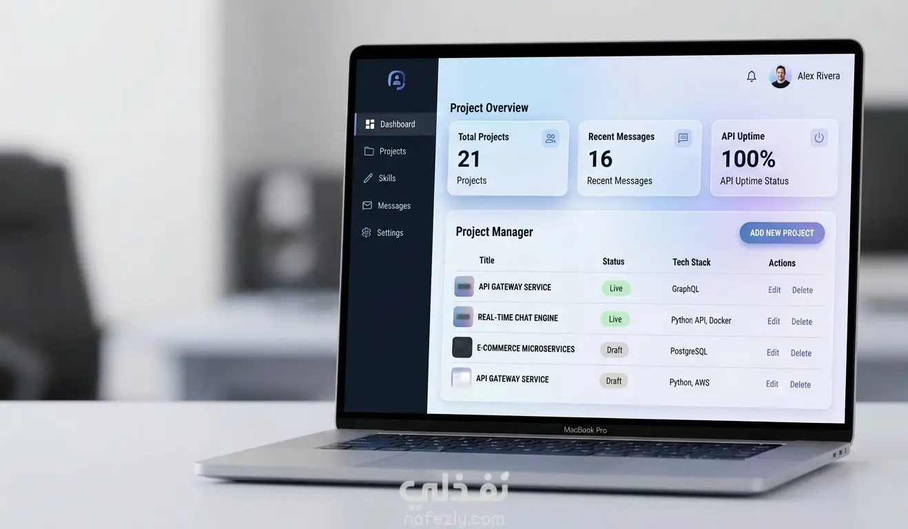 سوف تحصل على موقع بورتفليو مخصص وحديث ومتجاوب بالكامل، مصمم لعرض مهاراتك ومشاريعك بشكل احترافي. يشمل العمل لوحة تحكم (Dashboard) لإدارة الأقسام والمشاريع والمحتوى بسهولة، بالإضافة إلى تحسين محركات البحث (SEO) لزيادة ظهورك على الإنترنت.
