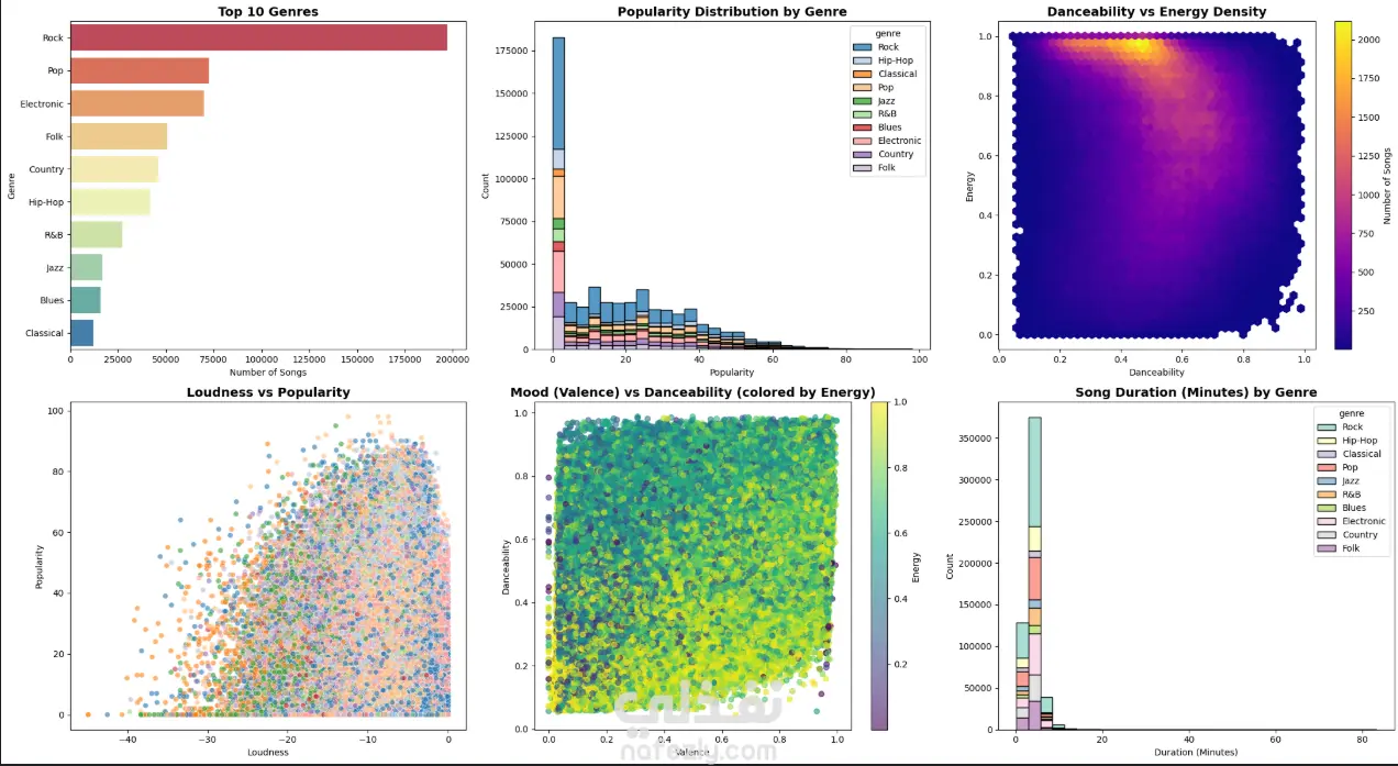 قمت بعمل تحليل استكشافي للبيانات (EDA) لمجموعة بيانات موسيقية بهدف فهم الأنماط بين أنواع الموسيقى وشعبيتها وخصائصها الصوتية.
