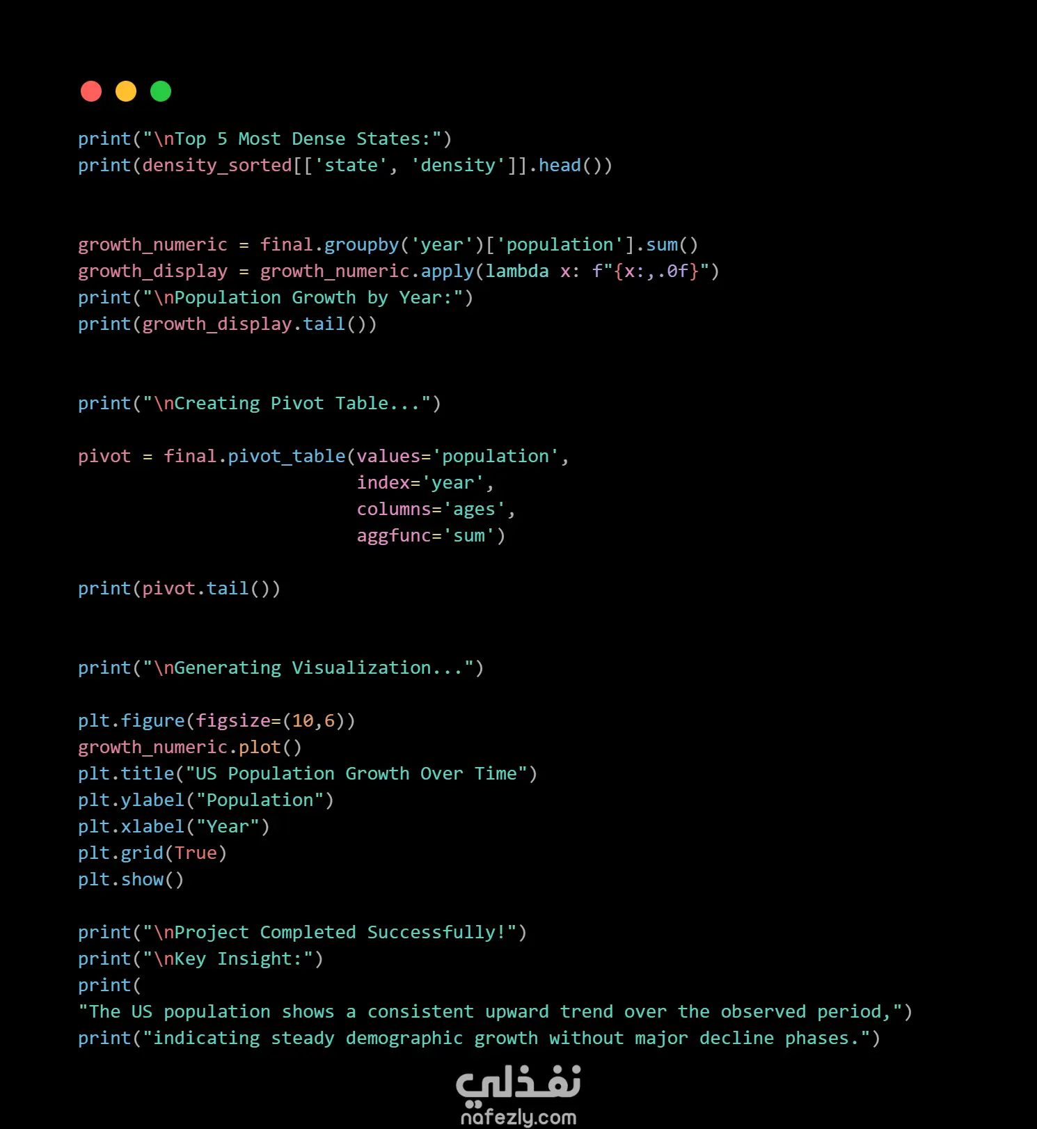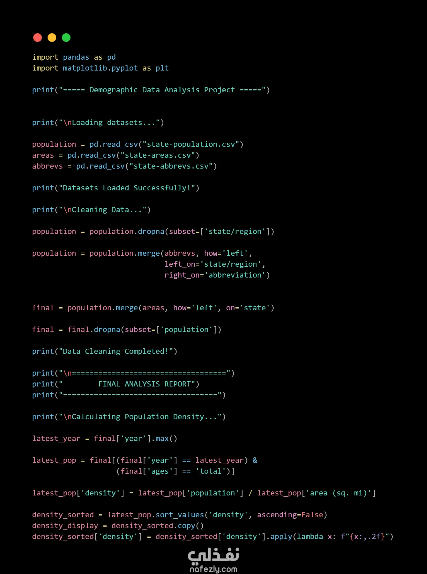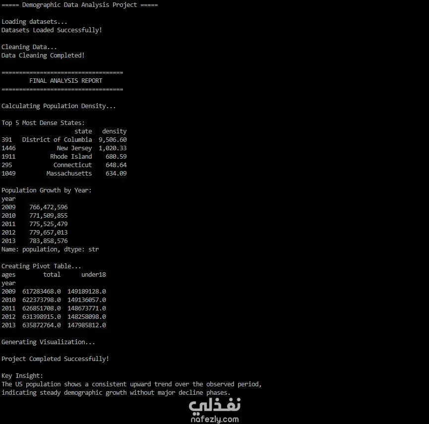 قمت بتنفيذ مشروع لتحليل البيانات الديموغرافية باستخدام لغة Python ومكتبات تحليل البيانات مثل Pandas و Matplotlib بهدف استخراج معلومات مفيدة من بيانات السكان في الولايات المتحدة. يتضمن المشروع عدة مراحل أساسية في تحليل البيانات تبدأ بتحميل البيانات من ملفات CSV ثم تنظيف البيانات ومعالجتها قبل تنفيذ عمليات التحليل واستخراج النتائج. مراحل العمل في المشروع: تحميل عدة مجموعات بيانات خاصة بالسكان والمساحات والاختصارات الخاصة بالولايات تنظيف البيانات ومعالجة القيم المفقودة دمج مجموعات البيانات المختلفة باستخدام عمليات Data Merge حساب الكثافة السكانية لكل ولاية استخراج أكثر الولايات كثافة سكانية تحليل نمو السكان عبر السنوات إنشاء Pivot Table لتحليل توزيع الفئات العمرية إنشاء رسم بياني يوضح نمو السكان بمرور الوقت كما يقوم البرنامج بعرض تقرير نهائي يتضمن أهم النتائج والمؤشرات المستخرجة من البيانات، بالإضافة إلى رسم بياني يوضح اتجاه نمو السكان.