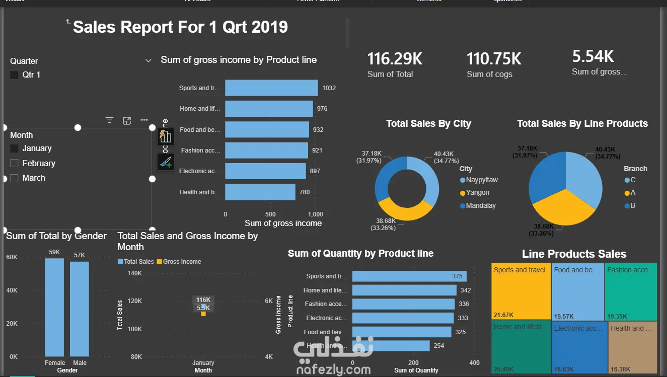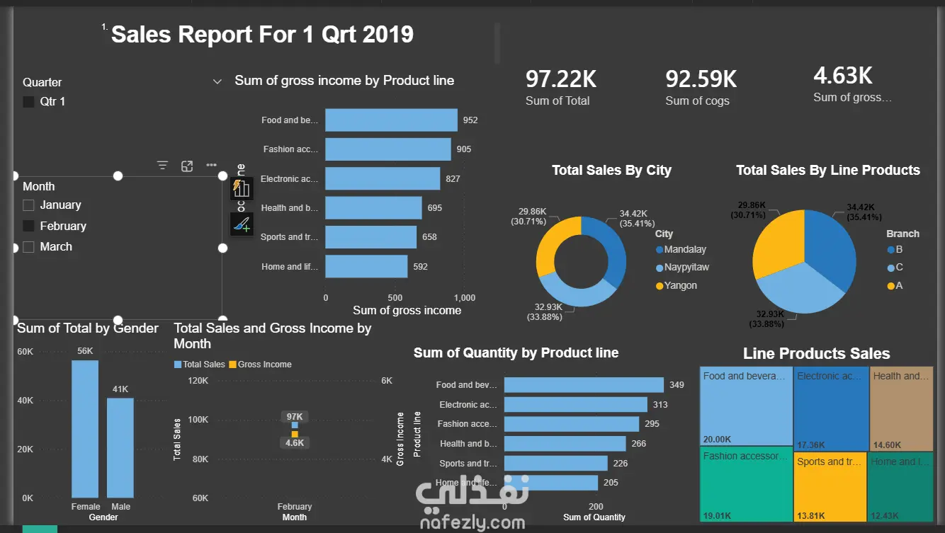 تم تنفيذ مشروع تحليل بيانات شامل لسلسلة سوبر ماركت لاول 3 شهور لعام 2019، يهدف إلى تحويل البيانات الخام إلى رؤى (Insights) تدعم اتخاذ القرار. أبرز مميزات المشروع: بناء لوحة تحكم تفاعلية (Interactive Dashboard): تتيح تصفية البيانات حسب الربع السنوي (Quarter) والشهر. أتمتة البيانات (Automation): الداش بورد مصمم ليعالج أي بيانات جديدة تُضاف تلقائياً بمجرد التحديث. مؤشرات الأداء الرئيسية (KPIs): حساب إجمالي المبيعات ($322.97K)، تكلفة البضاعة المباعة ($307.59K)، وصافي الربح ($15.38K). تحليل سلوك المستهلك: مقارنة حجم المبيعات بين الإناث ($168K) والذكور ($155K). التحليل الجغرافي واللوجستي: تحديد المدن (Yangon, Naypyitaw, Mandalay) والفروع الأكثر مبيعاً. تحليل المنتجات (Product Performance): مراقبة أداء 6 خطوط إنتاج مختلفة من حيث الكميات المباعة والربحية. تحليل زمني: رسم بياني (Line Chart) يوضح العلاقة بين المبيعات والربح شهرياً لاكتشاف المواسم الشرائية.