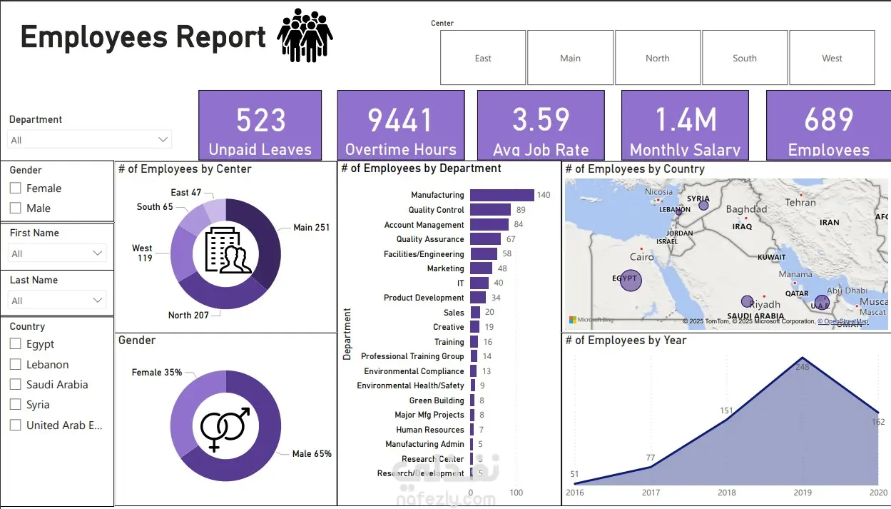 تم تصميم هذا الداشبورد الاحترافي لتحليل بيانات الموارد البشرية بشكل شامل ومرن. يعرض الداشبورد مؤشرات رئيسية مثل إجمالي الموظفين (689)، الراتب الشهري (1.4M)، ساعات العمل الإضافي (9441)، وإجازات بدون راتب (523). يتضمن تحليلاً تفصيلياً لتوزيع الموظفين حسب الإدارة والمركز والجنس والدولة، مع رسم بياني يوضح نمو التوظيف عبر السنوات. يدعم الداشبورد فلاتر تفاعلية للتصفية حسب الإدارة، الجنس، الاسم، والدولة.