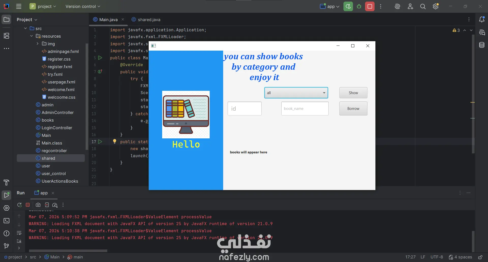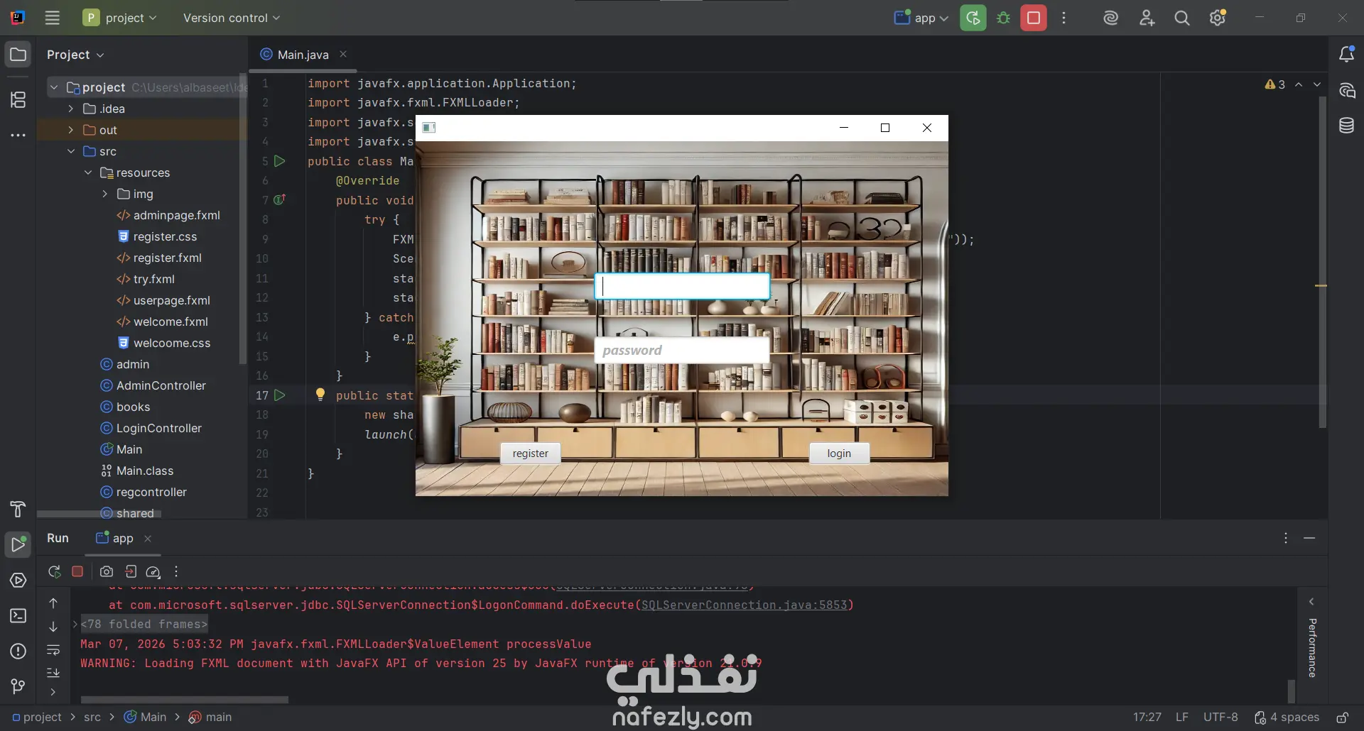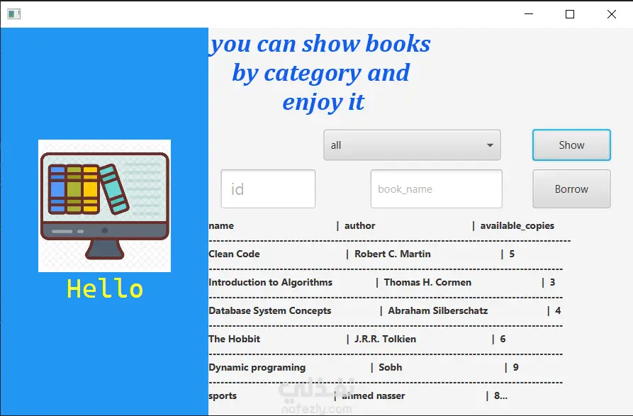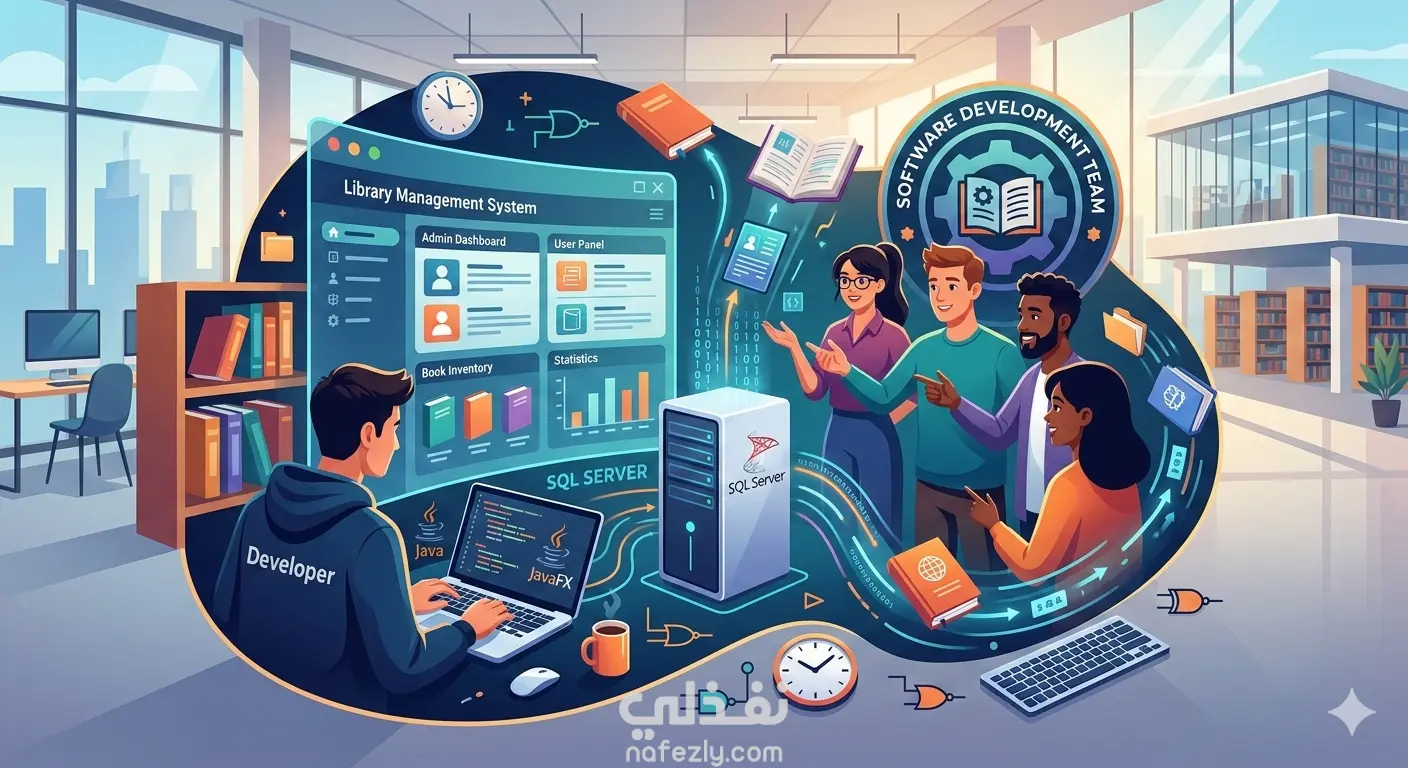 ام إدارة المكتبة الذكي (Library Management System) هو مشروع يهدف إلى تسهيل العمليات الإدارية داخل المكتبات وتحويلها إلى نظام رقمي فعال. تم تصميم النظام باستخدام لغة Java مع واجهات رسومية متطورة تعتمد على تقنية JavaFX، مما يوفر تجربة مستخدم سلسة وسهلة التعامل. تم تطوير هذا النظام لخدمة فئتين من المستخدمين: الإدارة (Admins) والمستفيدين (Users)، مع الربط المباشر بقاعدة بيانات SQL Server لضمان دقة وتأمين البيانات. أهم المميزات: إدارة الكتب: يتيح النظام للمسؤولين إضافة كتب جديدة، وتحديث عدد النسخ المتاحة، أو البحث عن الكتب حسب الفئة (برمجة، قواعد بيانات، روايات). عمليات الاستعارة والرد: يوفر النظام آلية دقيقة لاستعارة الكتب مع التحقق من هوية المستخدم، كما يتضمن نظاماً آلياً لحساب الغرامات في حال التأخر عن موعد التسليم. إدارة المستخدمين: يمكن للمسؤولين حذف حسابات المستخدمين (بشرط إعادة كافة الكتب المستعارة أولاً)، بالإضافة إلى نظام تسجيل دخول وتسجيل حسابات جديد آمن. تنبيهات ذكية: يتميز النظام بأسلوب تفاعلي، حيث يقدم تنبيهات تنبيهية وتحذيرية بلمسة فكاهية أحياناً لتعزيز تجربة المستخدم. فريق العمل هذا المشروع هو ثمرة تعاون جماعي متميز، حيث تم تنفيذه بواسطة تيم (Team) من المطورين الذين عملوا على ربط مفاهيم البرمجة الكائنية (OOP) بقواعد البيانات والواجهات الرسومية لإنتاج حل تقني متكامل.