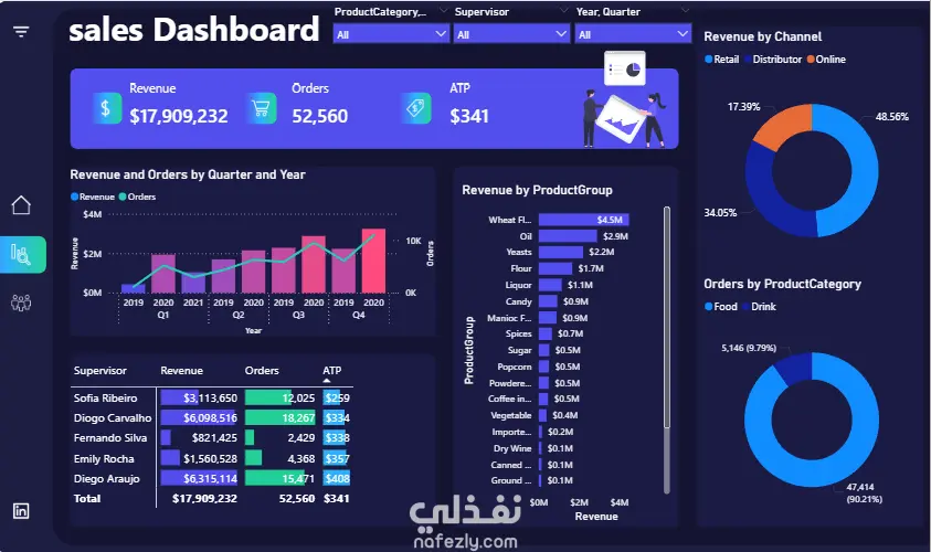 الهدف: عرض شامل لعمليات المبيعات وتوزيع الإيرادات (أكثر من 52 ألف طلب). العمليات: بناء فلاتر تفاعلية للمشرفين والمنتجات مع ربط القنوات البيعية المختلفة. النتيجة: رؤية كاملة لمتوسط سعر المعاملة (ATP) وأداء القنوات لسرعة اتخاذ القرارات التجارية.