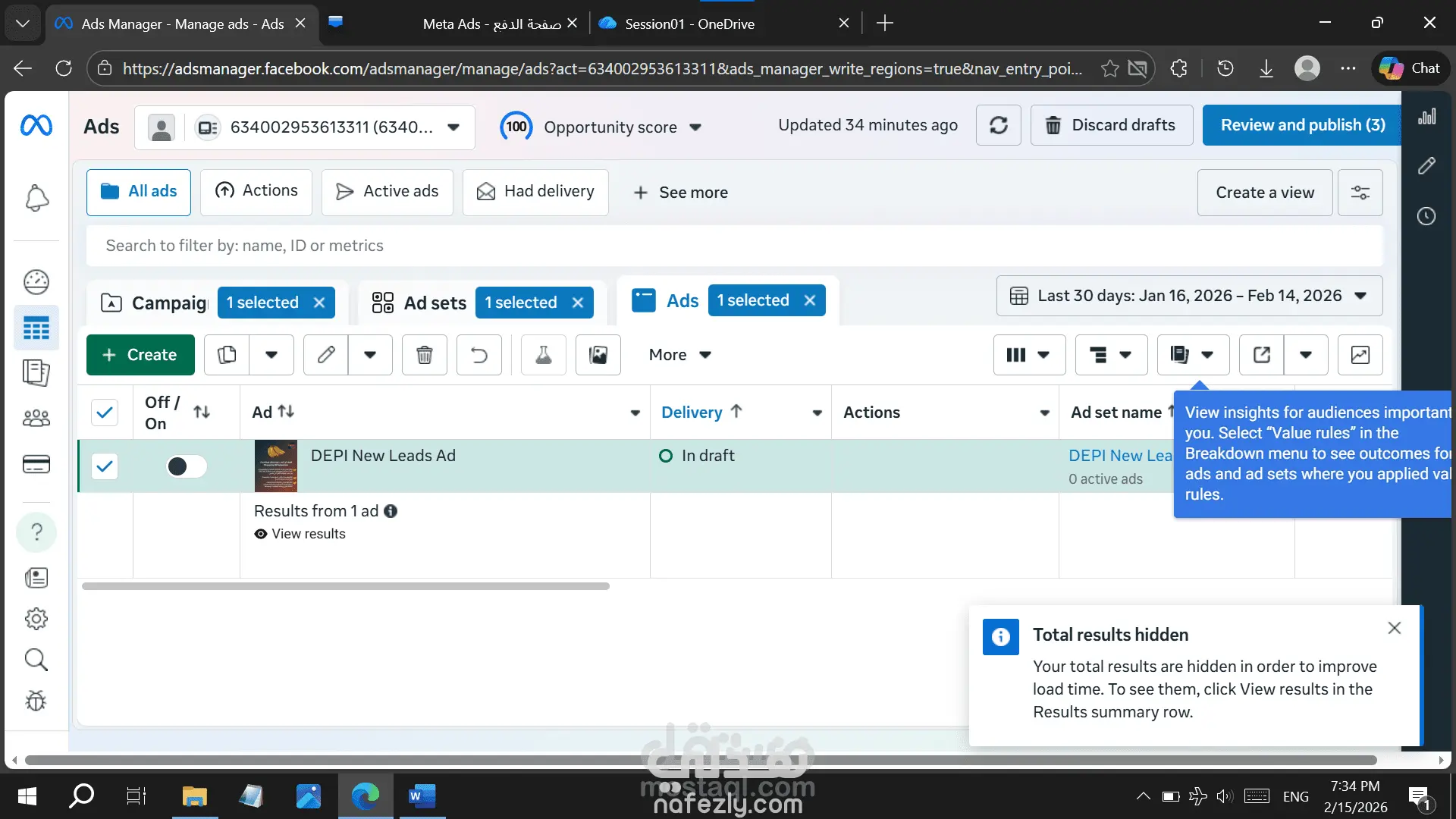 تُظهر لقطة الشاشة المرفقة من داخل مدير الإعلانات وصول الحملة لمرحلة الجاهزية التامة للإطلاق، ويعكس هذا الإعداد عدة جوانب احترافية:
