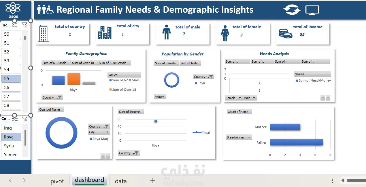 المشروع بيهدف لتحليل توزيع الأسر المحتاجة بناءً على: التوزيع الجغرافي: (ليبيا، سوريا، العراق، اليمن) والمدن التابعة ليها. التركيبة السكانية: عدد الذكور والإناث، الفئات العمرية (أقل من 5 سنوات، من 6-18 سنة، وأكبر من 18). نوع الاحتياج: (غذاء، ملابس، تعليم، دعم مادي).