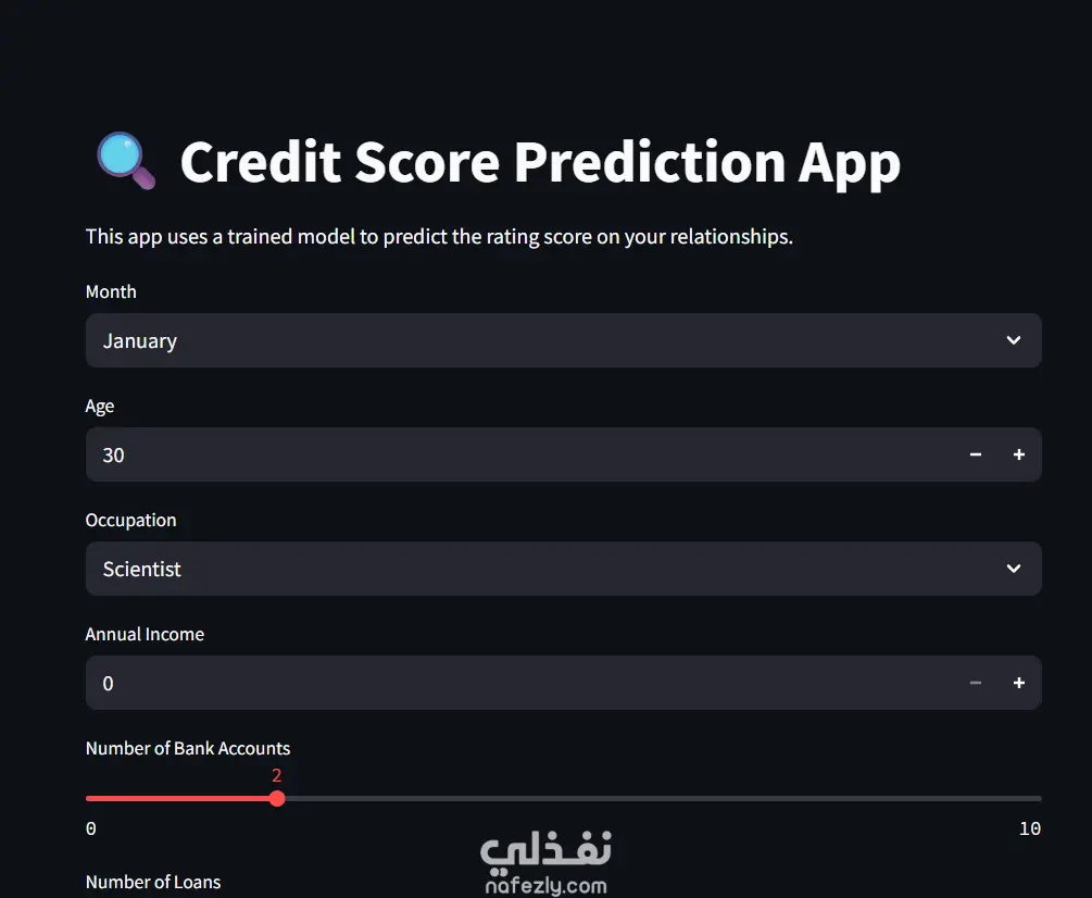 إدخال البيانات المالية (الدخل، عدد القروض، الديون القائمة).