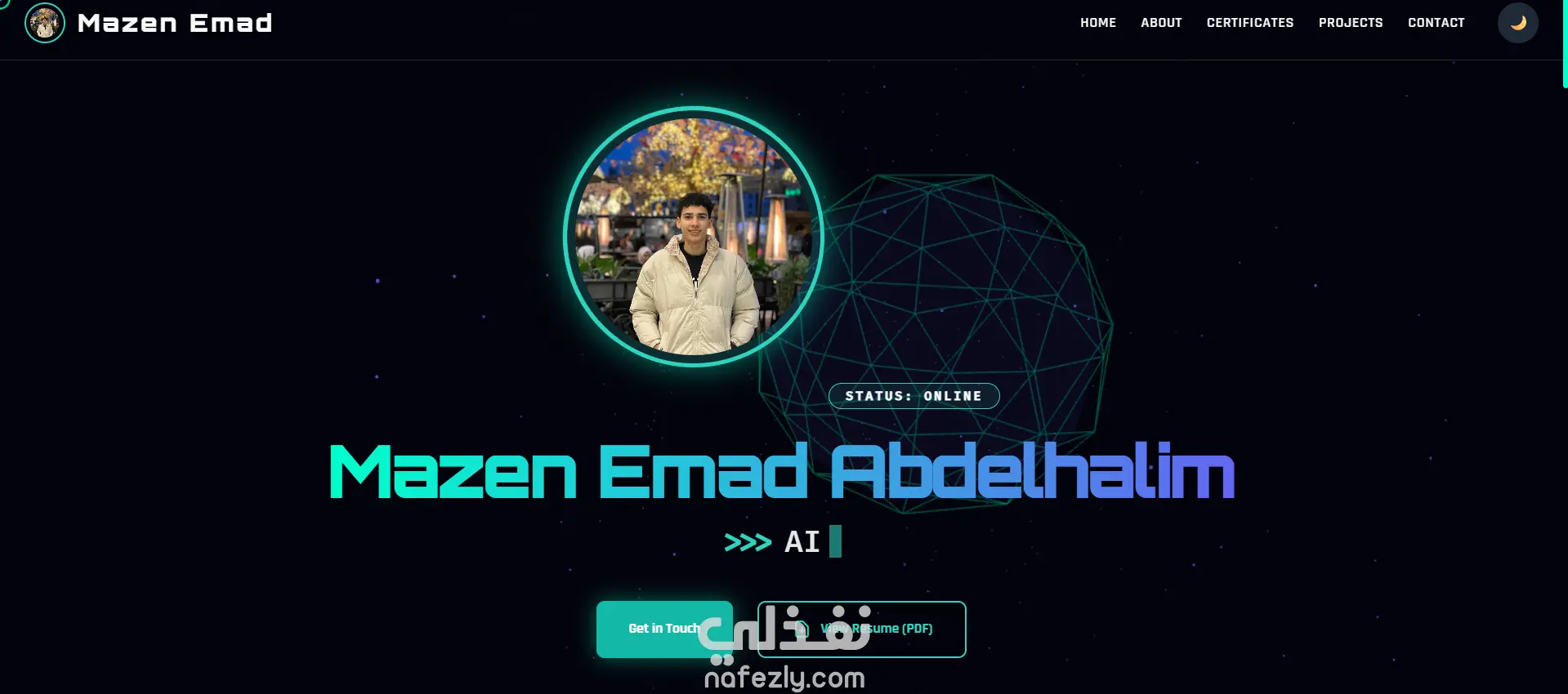 رسومات ثلاثية الأبعاد (3D Visualization): دمج مكتبة Three.js لإنشاء "نواة عصبية" (Neural Core) تفاعلية في الخلفية تتحرك مع حركة الماوس والتمرير (Scroll)، مما يعطي طابعاً مستقبلياً يتماشى مع تخصص الذكاء الاصطناعي.