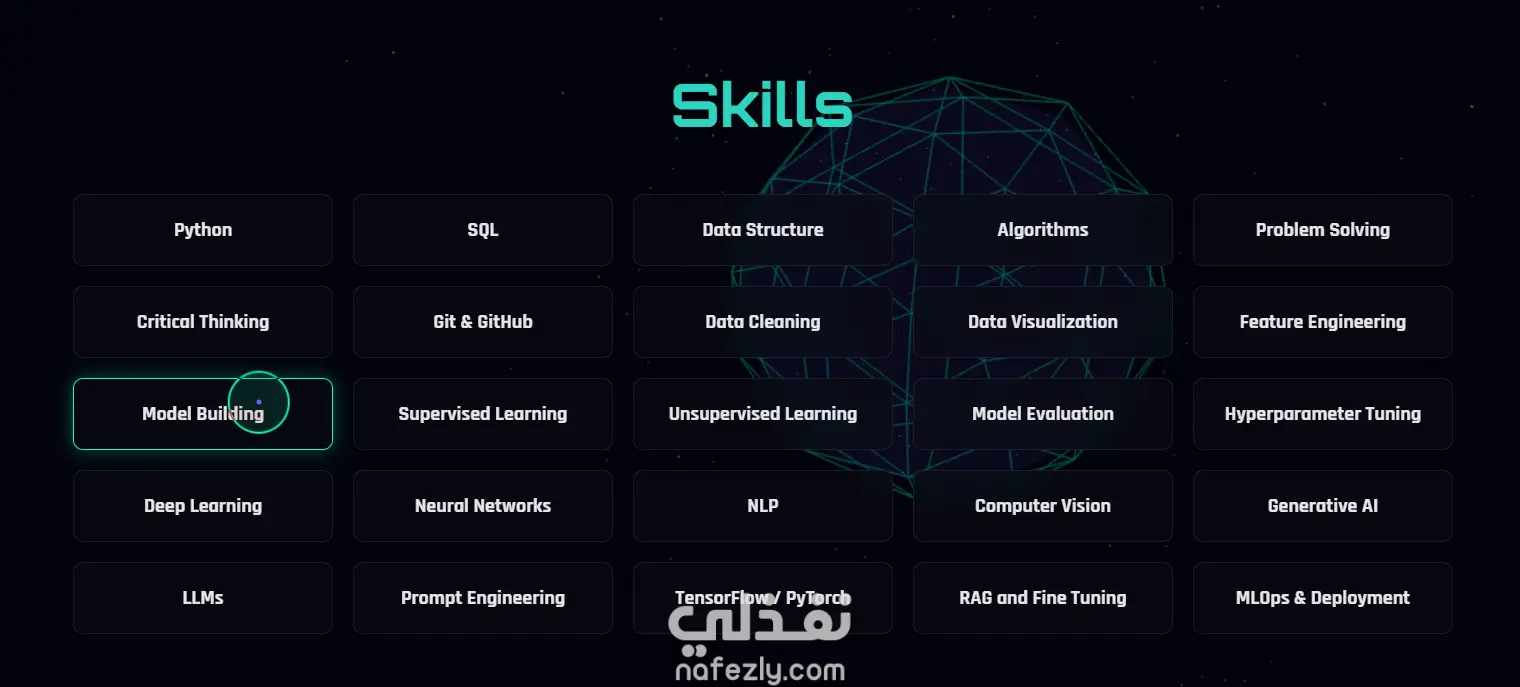 قمت بتصميم وتطوير موقع شخصي (Portfolio) متكامل يعتمد على مفهوم الـ "Cyberpunk" والذكاء الاصطناعي، ليكون واجهة احترافية تعرض مشاريعي في مجال الـ AI وData Science. الموقع يتميز بتجربة مستخدم (UX) فريدة تعتمد على التفاعل البصري والأنيميشن المتقدم.