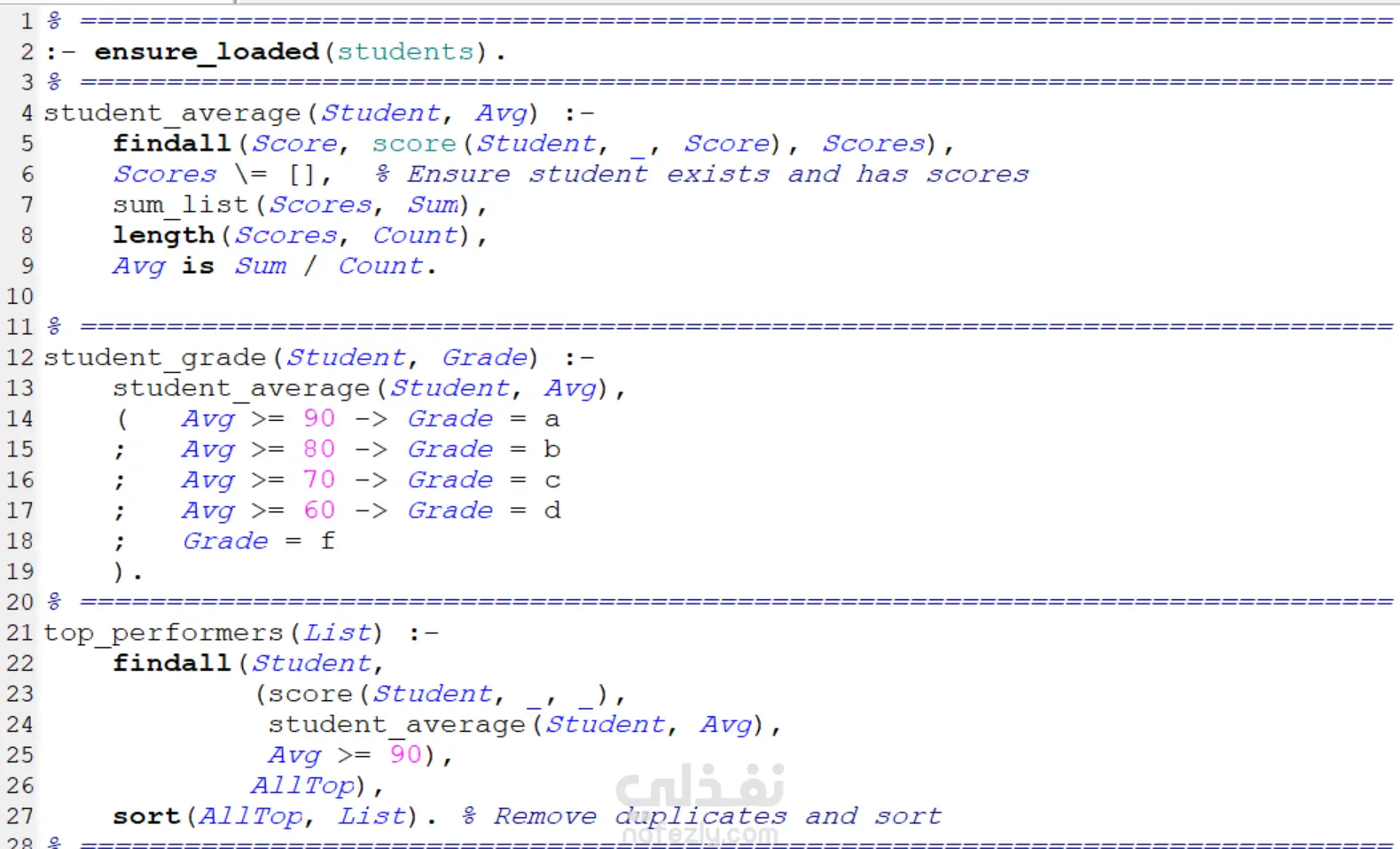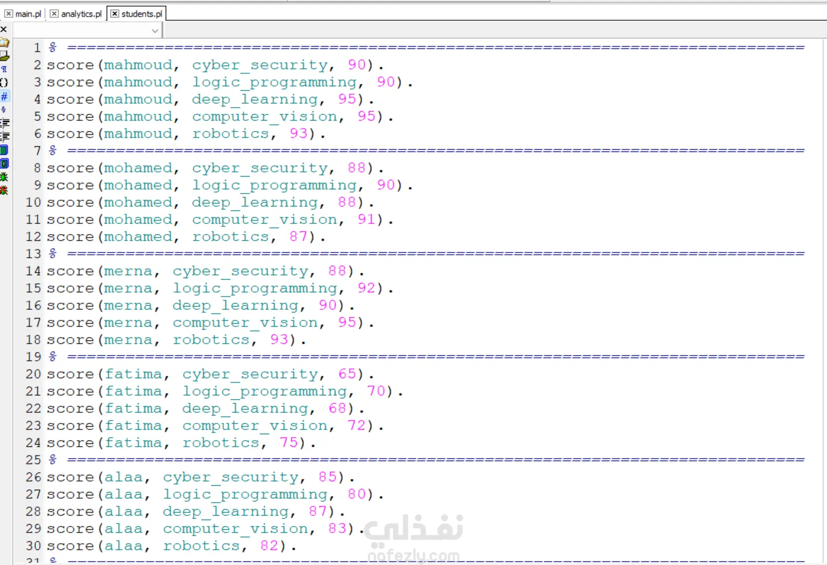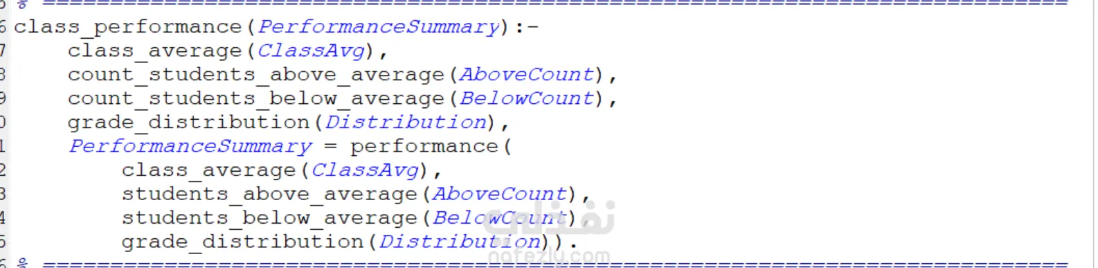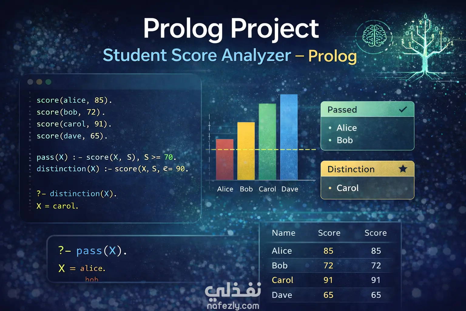 تم تطوير نظام تحليلي قائم على لغة Prolog لتحليل درجات الطلاب وتقييم أدائهم الأكاديمي باستخدام البرمجة المنطقية. يعتمد النظام على قاعدة معرفة تحتوي على درجات الطلاب في مواد مختلفة، ويستخدم قواعد استدلال (Rules) لاستخراج معلومات وتحليلات دقيقة.
