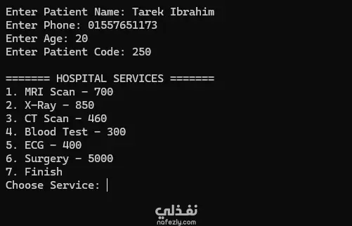 هذا المشروع عبارة عن نظام بسيط لإدارة بيانات المرضى والخدمات الطبية داخل مستشفى باستخدام لغة البرمجة C++ مع تطبيق مفاهيم البرمجة كائنية التوجه (OOP). يهدف النظام إلى تنظيم بيانات المرضى والخدمات الطبية المقدمة لهم، بالإضافة إلى حساب التكلفة الإجمالية للخدمات التي يحصل عليها المريض بشكل تلقائي. فكرة عمل النظام يقوم المستخدم بإدخال بيانات المريض مثل: اسم المريض رقم الهاتف العمر كود المريض بعد ذلك يمكن للمستخدم اختيار الخدمات الطبية التي يحتاجها المريض مثل: MRI X-Ray CT Scan ويتم حفظ هذه الخدمات داخل النظام، ثم يقوم البرنامج بحساب إجمالي تكلفة الخدمات الطبية التي تم اختيارها وعرض ملخص كامل يحتوي على بيانات المريض والخدمات التي حصل عليها. التقنيات المستخدمة في المشروع تم بناء المشروع باستخدام عدة مفاهيم برمجية مهمة مثل: البرمجة كائنية التوجه (OOP) استخدام Classes و Objects استخدام Vector لتخزين الخدمات الطبية تقسيم المشروع إلى عدة ملفات لزيادة تنظيم الكود إنشاء دوال لإضافة الخدمات وعرض البيانات وحساب التكلفة مكونات المشروع يتكون المشروع من عدة ملفات رئيسية: ملف Patient لإدارة بيانات المريض ملف Services لتعريف الخدمات الطبية ملف HospitalManager لحساب التكلفة الإجمالية للخدمات ملف Main لتشغيل البرنامج والتعامل مع المستخدم الهدف من المشروع يهدف هذا المشروع إلى تطبيق مفاهيم البرمجة الأساسية وتنظيم الكود بطريقة احترافية، بالإضافة إلى محاكاة نظام بسيط يمكن استخدامه لإدارة بيانات المرضى والخدمات الطبية داخل المستشفيات أو المراكز الطبية. المهارات التي يوضحها المشروع البرمجة باستخدام لغة C++ تصميم الأنظمة البرمجية البسيطة تنظيم الكود وتقسيمه إلى ملفات التعامل مع البيانات وحساب النتائج