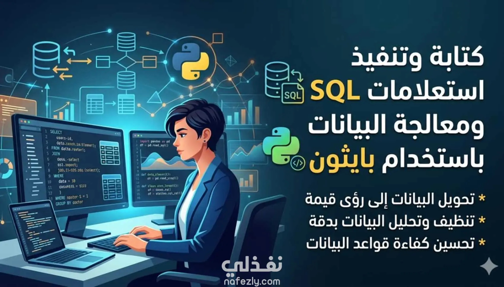 تصميم استعلامات SQL دقيقة (SELECT، JOIN، GROUP BY). • استخراج البيانات وتنظيفها وتحويلها إلى صيغ قابلة للاستخدام. • ربط قواعد البيانات مع بايثون لأتمتة العمليات. • تحليل البيانات باستخدام مكتبات بايثون (Pandas).