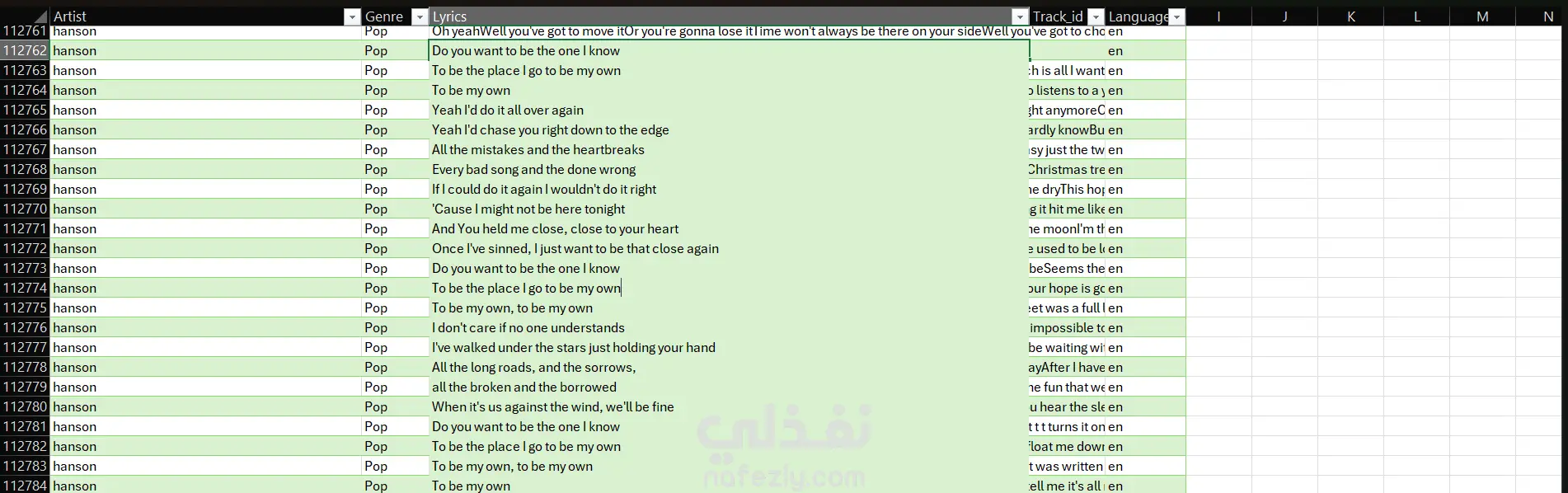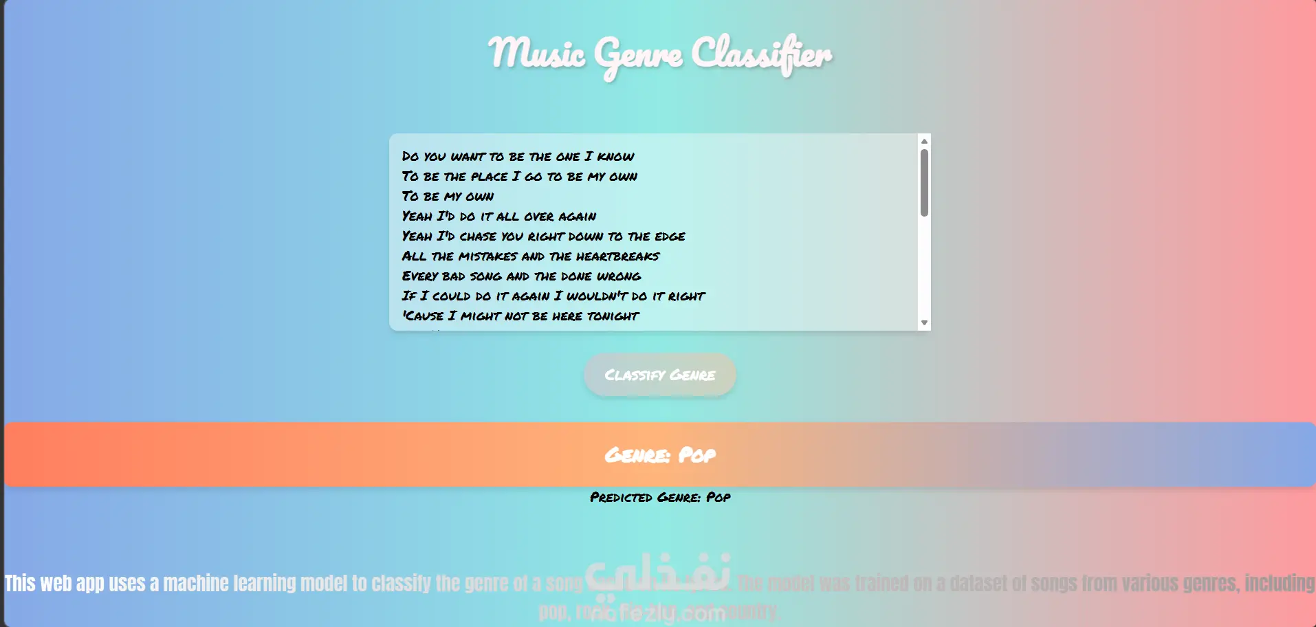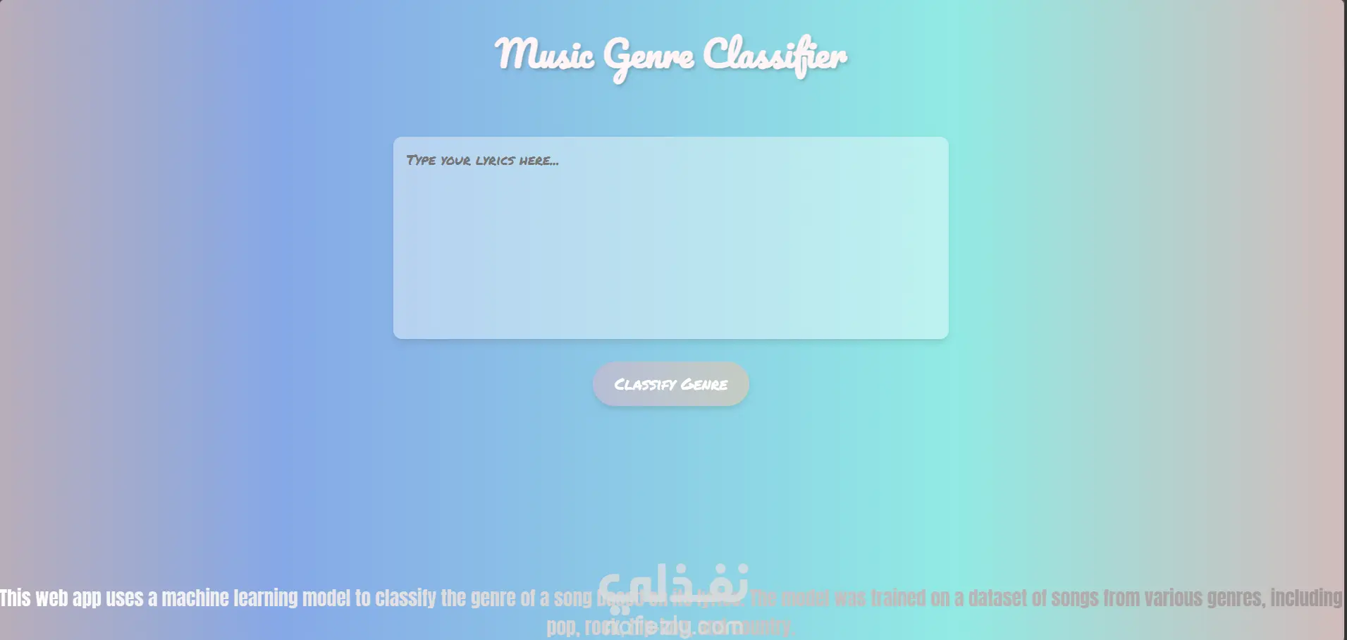 يركز هذا المشروع على تصنيف أنواع الأغاني باستخدام (NLP). تتضمن مجموعة البيانات كلمات الأغاني بالإضافة إلى البيانات الوصفية (اسم الأغنية، السنة، الفنان، والنوع). تتضمن آلية العمل تنظيف البيانات ومعالجتها المسبقة، يليها تطبيق نماذج مختلفة للتعلم الآلي والتعلم العميق. تشمل النماذج المختبرة TF-IDF مع LSTM و بعض النماذج الاخرى.لكن تُظهر النتائج أن نموذج LSTM كان الأفضل أداءً في التنبؤ بالنوع الموسيقي الصحيح بناءً على كلمات الأغاني.