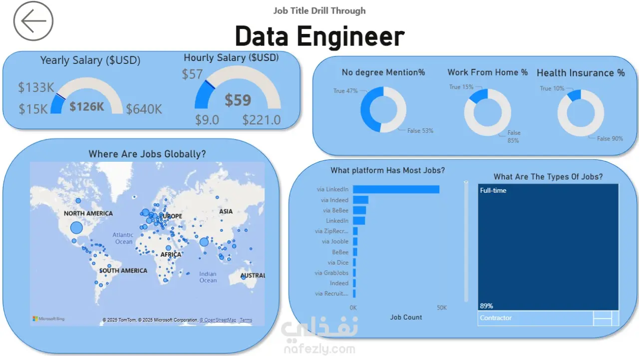 وحة معلومات وظائف البيانات (Data Jobs Dashboard) لوحة تفاعلية باستخدام Power BI لتحليل وظائف ورواتب مجال البيانات عالميًا عبر أدوار مختلفة ودول وأنواع توظيف متعددة. يقدّم هذا المشروع رؤى قيّمة للمهنيين، وشركات التوظيف، والمؤسسات لفهم اتجاهات سوق العمل في مجال البيانات. ? نظرة عامة على المشروع يستخدم هذا المشروع أداة Power BI لتحويل بيانات إعلانات الوظائف الخام إلى تصورات ورسوم بيانية واضحة ومفيدة. الأهداف الرئيسية: تحليل الطلب على وظائف البيانات (مهندس بيانات، محلل بيانات، عالم بيانات، مهندس تعلم آلي، وغيرها). مقارنة الرواتب السنوية والساعة حسب الدور والدولة. دراسة اتجاهات توزيع الوظائف خلال عام 2024. تحديد أبرز المنصات (LinkedIn، Indeed، وغيرها) لفرص العمل. تسليط الضوء على أنواع التوظيف (دوام كامل، عقود، تدريب، وغيرها). استكشاف المزايا مثل التأمين الصحي، العمل عن بُعد، ومتطلبات الشهادة الجامعية. ? أهم النتائج إجمالي عدد الوظائف: أكثر من 479 ألف إعلان. متوسط الراتب السنوي (الوسيط): 113 ألف دولار. متوسط الراتب بالساعة (الوسيط): 47.6 دولار. أبرز الوظائف: مهندس بيانات، محلل بيانات، عالم بيانات. المنصة الأكثر نشرًا للوظائف: LinkedIn. التوزيع العالمي: طلب مرتفع في أمريكا الشمالية وأوروبا وآسيا. أنواع الوظائف: 89٪ من الوظائف بدوام كامل. ? الأدوات والتقنيات المستخدمة Power BI → تصميم اللوحات، تنظيف البيانات، التحويل، وإنشاء التصورات البيانية. ? مميزات لوحة المعلومات ? اللوحة الرئيسية: ✔ عدد الوظائف حسب الدور ✔ تحليل الرواتب (سنوي وساعي) ✔ اتجاهات الوظائف الشهرية خلال 2024 ✔ مقارنة الرواتب حسب الدور ✔ تقييم الرواتب بنظام النجوم ? صفحة التفاصيل (Drill-Through) – مثال: مهندس بيانات ✔ نطاق الرواتب (الحد الأدنى – الحد الأقصى) ✔ التوزيع الجغرافي للوظائف (خريطة) ✔ تحليل منصات نشر الوظائف ✔ أنواع التوظيف (دوام كامل، عقد، إلخ) ✔ المزايا: متطلبات الشهادة، نسبة العمل عن بُعد، نسبة التأمين الصحي ? القيمة التجارية للمشروع تساعد هذه اللوحة في: المهنيين → تقييم المسارات المهنية وتوقعات الرواتب. الشركات → مقارنة الرواتب ووضع استراتيجيات التوظيف. مسؤولي التوظيف → تحديد أفضل المنصات وفرص التوظيف عالميًا.
