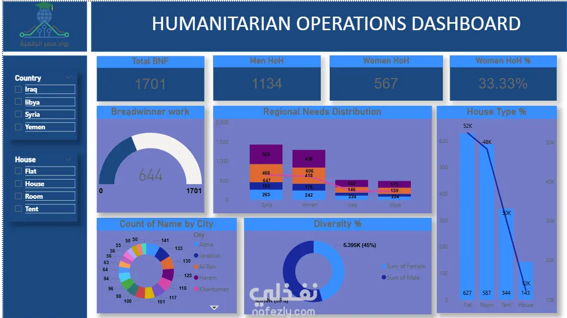 (Dashboard) خاصة بالعمليات الإنسانية، واسمها "HUMANITARIAN OPERATIONS DASHBOARD" 1. الفلاتر (Slicers) على الشمال: فيها أدوات تصفية عشان المستخدم يقدر يفلتر البيانات المعروضة بناءً على: البلد (Country): العراق، ليبيا، سوريا، واليمن. نوع السكن (House): شقة (Flat)، بيت (House)، غرفة (Room)، أو خيمة (Tent). 2. البطاقات (Cards / KPIs) في الشريط العلوي: بتعرض ملخص لأهم الأرقام في المشروع: إجمالي المستفيدين (Total BNF): 1701. الرجال المعيلين (Men HoH): 1134. النساء المعيلات (Women HoH): 567. نسبة النساء المعيلات (Women HoH %): 33.33%. 3. الرسوم البيانية (Visuals) في المنتصف والأسفل: عمل المعيل (Breadwinner work): رسم بياني من نوع Gauge بيوضح إن فيه 644 شخص بيعملوا من إجمالي 1701. توزيع الاحتياجات الإقليمية (Regional Needs Distribution): رسم بياني عمودي مكدس مدمج مع خط (Stacked Column with Line) بيقارن الاحتياجات بين الدول الأربعة (سوريا، اليمن، العراق، ليبيا). تعداد الأسماء حسب المدينة (Count of Name by City): مخطط دائري مجوف (Donut Chart) بيوزع الأعداد على مدن مختلفة زي (Atma, Jarablus, Al Bab، إلخ). نسبة التنوع (Diversity %): مخطط دائري مجوف بيوضح التوزيع الديموغرافي، الذكور (55% بعدد 6.510K) والإناث (45% بعدد 5.395K). 4. الرسم البياني على اليمين: نسبة نوع السكن (House Type %): مخطط مدمج (Combo Chart) بيقارن بين أعداد وأنواع السكن (شقة، غرفة، خيمة، بيت) باستخدام أعمدة للمحور الأساسي وخط للمحور الثانوي.
