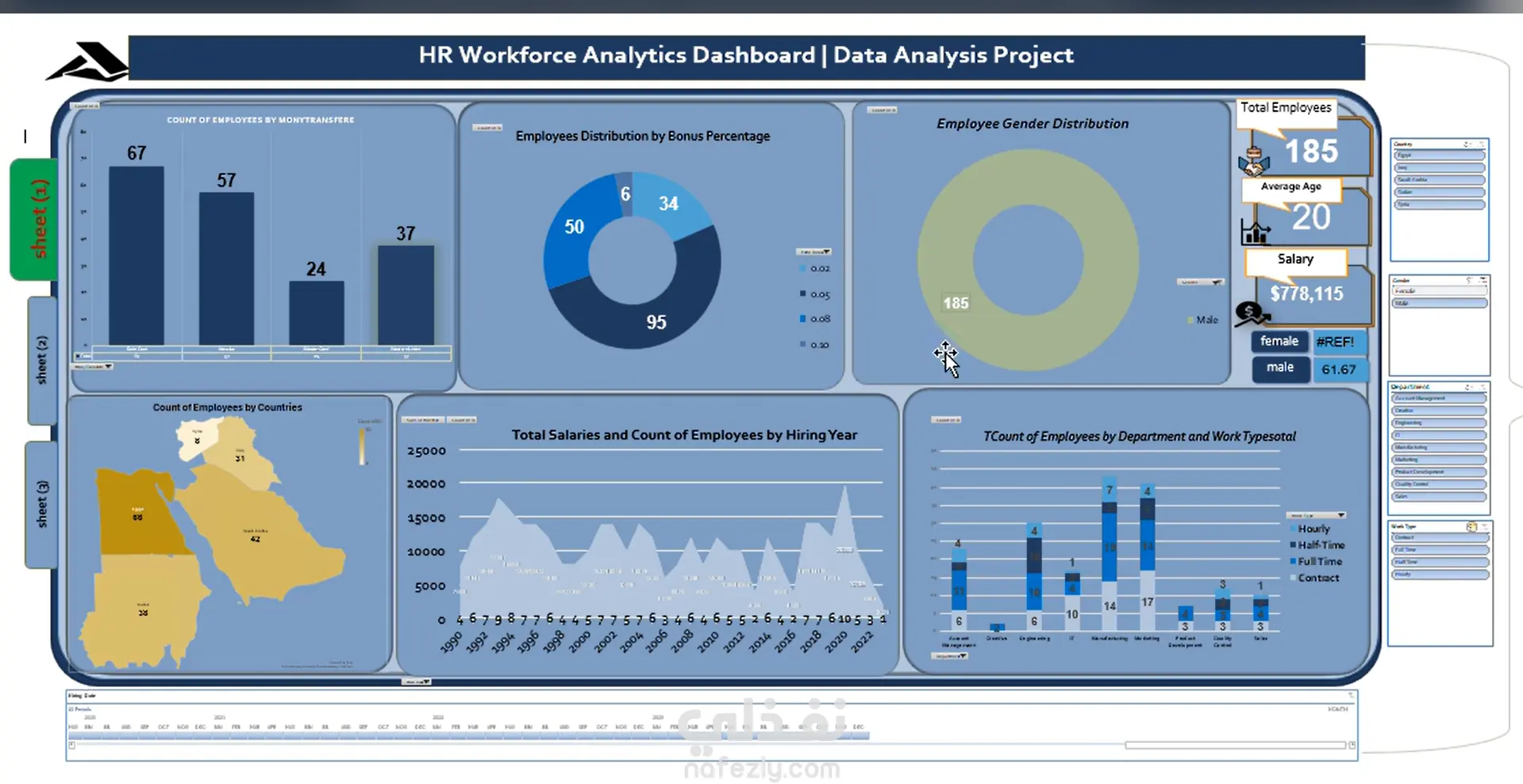 هذه اللوحة التحليلية توضح نظرة عامة على بيانات الموظفين داخل الشركة، وتهدف إلى تحليل توزيع الموظفين وفهم بعض المؤشرات المهمة الخاصة بالموارد البشرية. توضح اللوحة العدد الإجمالي للموظفين، ومتوسط عمر الموظفين، وإجمالي الرواتب، مما يعطي فكرة سريعة عن حجم القوى العاملة داخل الشركة. كما تعرض اللوحة توزيع الموظفين حسب نسبة المكافآت (Bonus) لمعرفة عدد الموظفين الذين يحصلون على مكافآت مختلفة. يوجد أيضًا رسم يوضح توزيع الموظفين حسب الجنس لمعرفة نسبة الذكور والإناث داخل المؤسسة. بالإضافة إلى ذلك، تحتوي اللوحة على تحليلات توضح عدد الموظفين حسب الأقسام ونوع العمل مثل العمل بدوام كامل أو جزئي. كما تعرض الخريطة توزيع الموظفين حسب الدول مما يساعد على فهم انتشار الموظفين جغرافيًا. بشكل عام تساعد هذه اللوحة في تحويل بيانات الموارد البشرية إلى معلومات واضحة تساعد الإدارة في فهم وضع الموظفين واتخاذ قرارات أفضل.