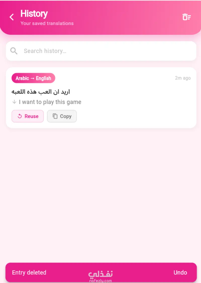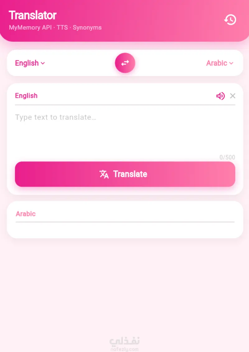 أقدم لك تطبيق ترجمة عصري مبني بـ Flutter يتميز بواجهة أنيقة وسلسة، يدعم الترجمة بين جميع اللغات مع مميزات متقدمة تجعل تجربة المستخدم احترافية ومريحة.