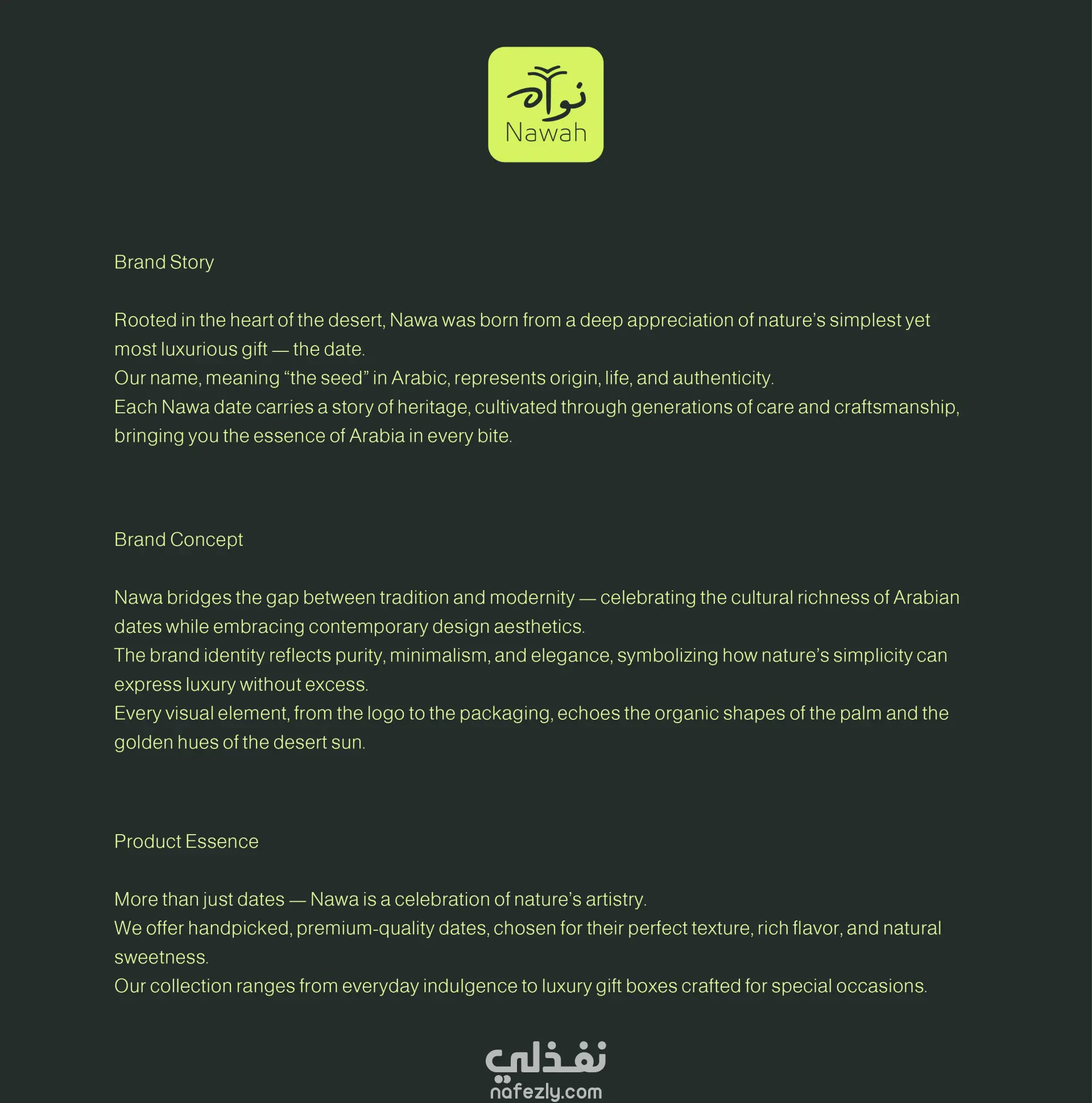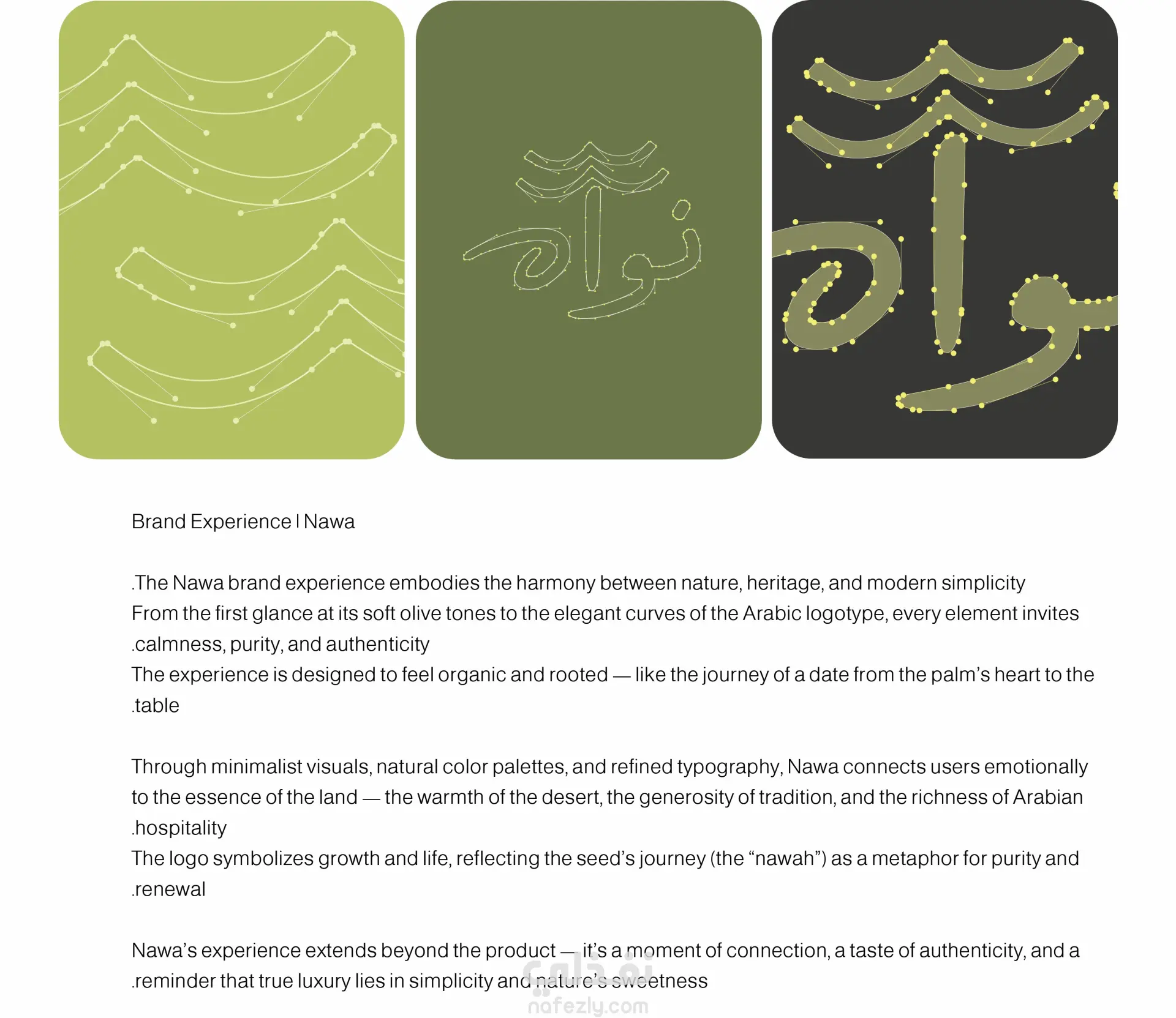 تجربة العلامة التجارية | نوا تجسد تجربة علامة نوا التجارية التناغم بين الطبيعة والتراث والبساطة العصرية. من النظرة الأولى إلى درجاتها الزيتونية الناعمة، مرورًا بانحناءات شعارها العربي الأنيقة، يدعو كل عنصر إلى الهدوء والنقاء والأصالة. صُممت التجربة لتكون طبيعية ومتجذرة، تمامًا كرحلة التمرة من قلب النخلة إلى المائدة. من خلال تصميمات بصرية بسيطة، وألوان طبيعية، وخطوط راقية، تربط نوا المستخدمين عاطفيًا بجوهر الأرض - دفء الصحراء، وكرم التقاليد، وكرم الضيافة العربية. يرمز الشعار إلى النمو والحياة، ويعكس رحلة البذرة ("النواة") كاستعارة للنقاء والتجدد. تتجاوز تجربة نوا المنتج نفسه، فهي لحظة تواصل، وتذوق للأصالة، وتذكير بأن الفخامة الحقيقية تكمن في البساطة وحلاوة الطبيعة.