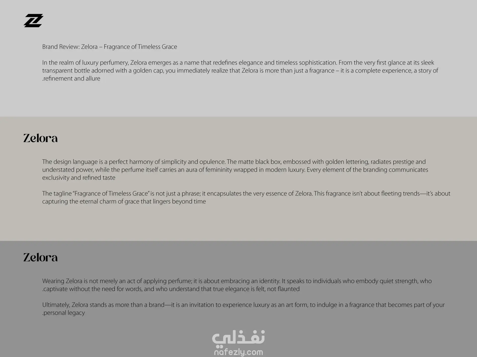زيلورا (Zelora) هو براند عطور فاخر يجسد مفهوم الأناقة الخالدة والرفاهية الهادئة. يقوم على فلسفة تمزج بين البساطة الراقية والتصميم الفاخر، حيث تعكس كل تفصيلة من تفاصيل العلامة هوية متكاملة من الذوق الرفيع والجاذبية العصرية. يتميز البراند بتقديم تجربة عطرية متكاملة لا تقتصر على الرائحة فقط، بل تمتد لتكون قصة من الفخامة والرقي تعبر عن شخصية من يرتديها. يركز Zelora على إبراز الجمال الكلاسيكي بأسلوب حديث، ليمنح مستخدميه حضوراً مميزاً وإحساساً بالثقة والأناقة التي تتجاوز حدود الزمن.