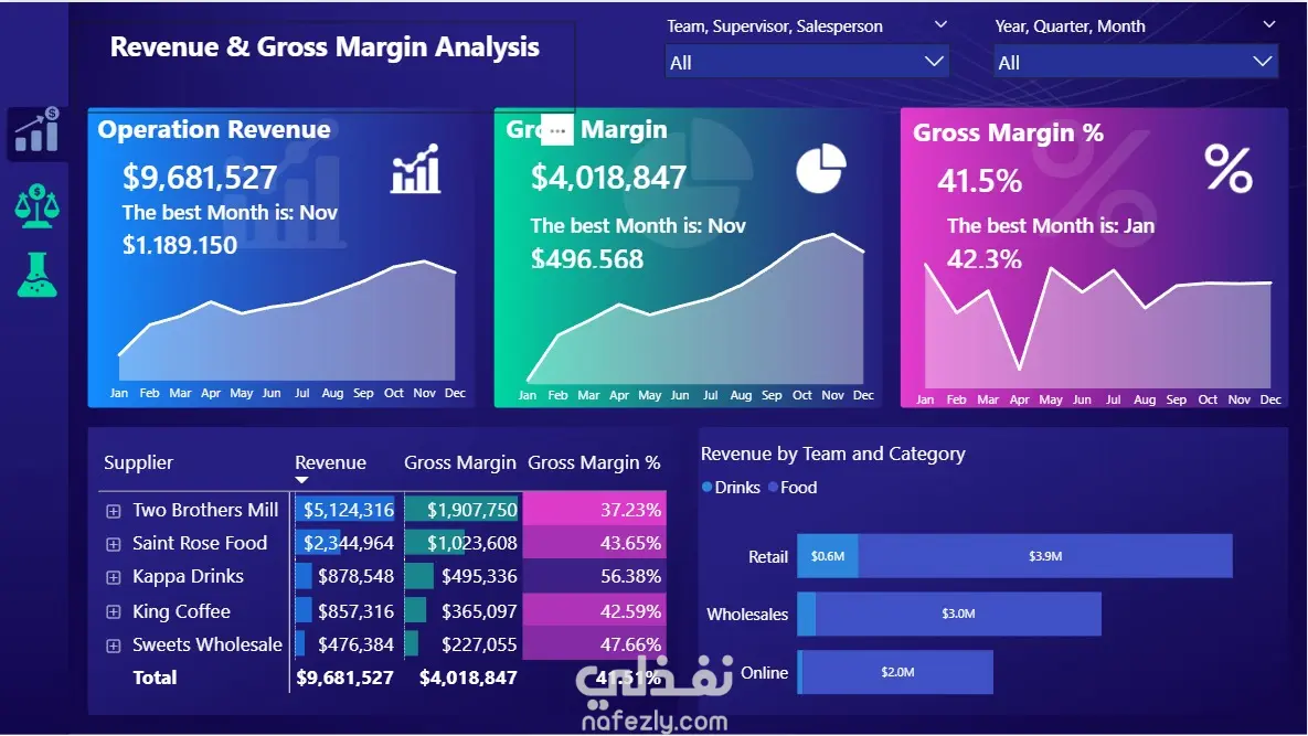 قمت بتطوير لوحة تحكم تحليلية باستخدام Power BI لتحليل أداء الإيرادات وهامش الربح بشكل تفاعلي يساعد الشركات على فهم الأداء المالي واتخاذ قرارات مبنية على البيانات. تعرض اللوحة مؤشرات أداء رئيسية مثل: إجمالي الإيرادات، إجمالي الربح، نسبة هامش الربح، وأفضل شهر من حيث الأداء. كما توفر تحليلات متقدمة مثل تحليل أداء الموردين من حيث الإيرادات والربحية، وتحليل الإيرادات حسب الفريق والفئة (Retail – Wholesale – Online) لمعرفة مصادر الدخل الرئيسية. تتضمن اللوحة أيضًا تحليل الاتجاهات الشهرية لاكتشاف الأنماط الموسمية وتحديد أفضل فترات الأداء. كما تحتوي على فلاتر تفاعلية تسمح بتحليل البيانات حسب الفريق أو المشرف أو المندوب أو الفترة الزمنية. تساعد هذه اللوحة الشركات على فهم بياناتها بشكل أفضل وتحديد فرص النمو وتحسين الربحية. الأدوات المستخدمة: Power BI – DAX – Data Analysis – Business Intelligence