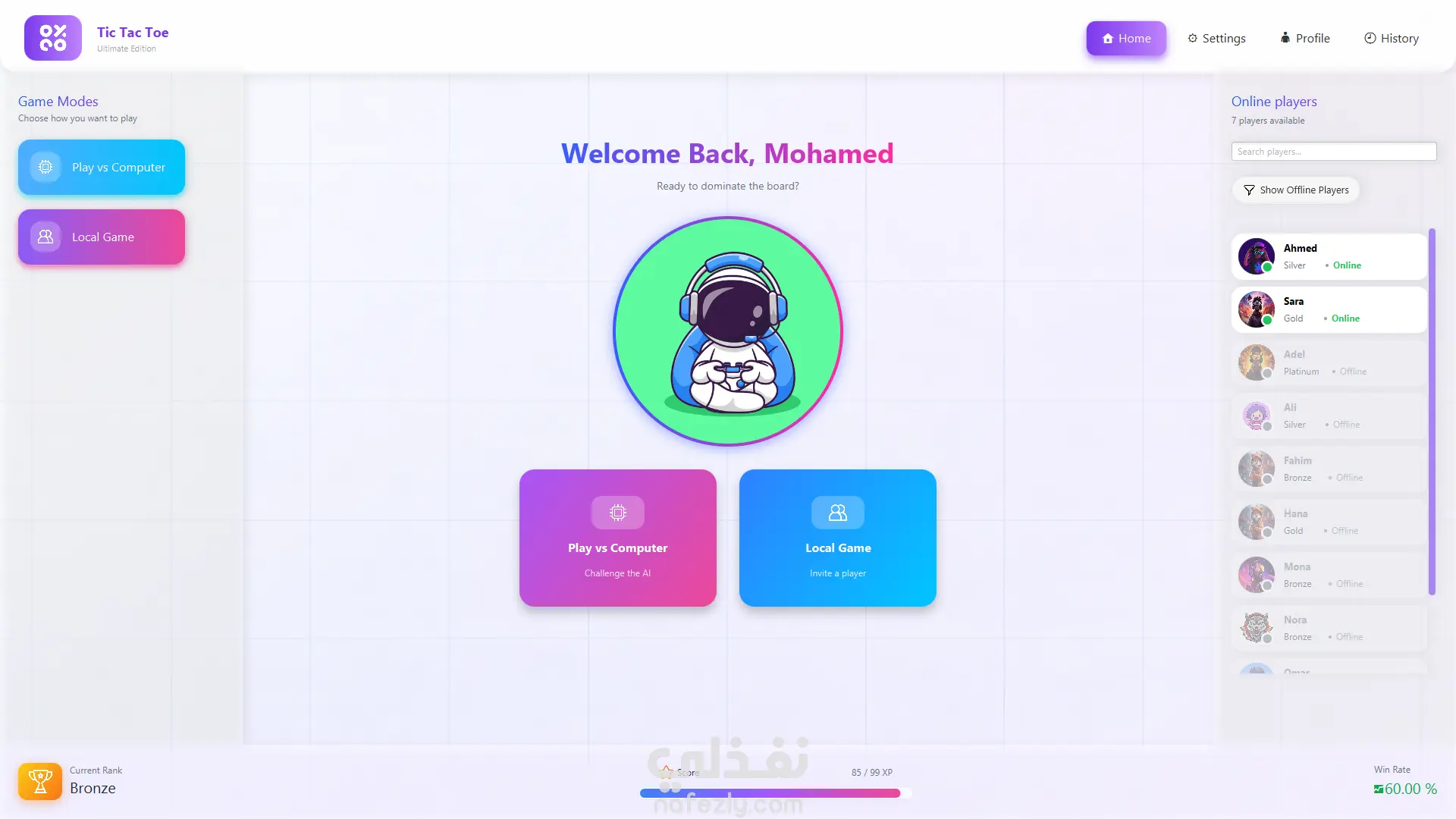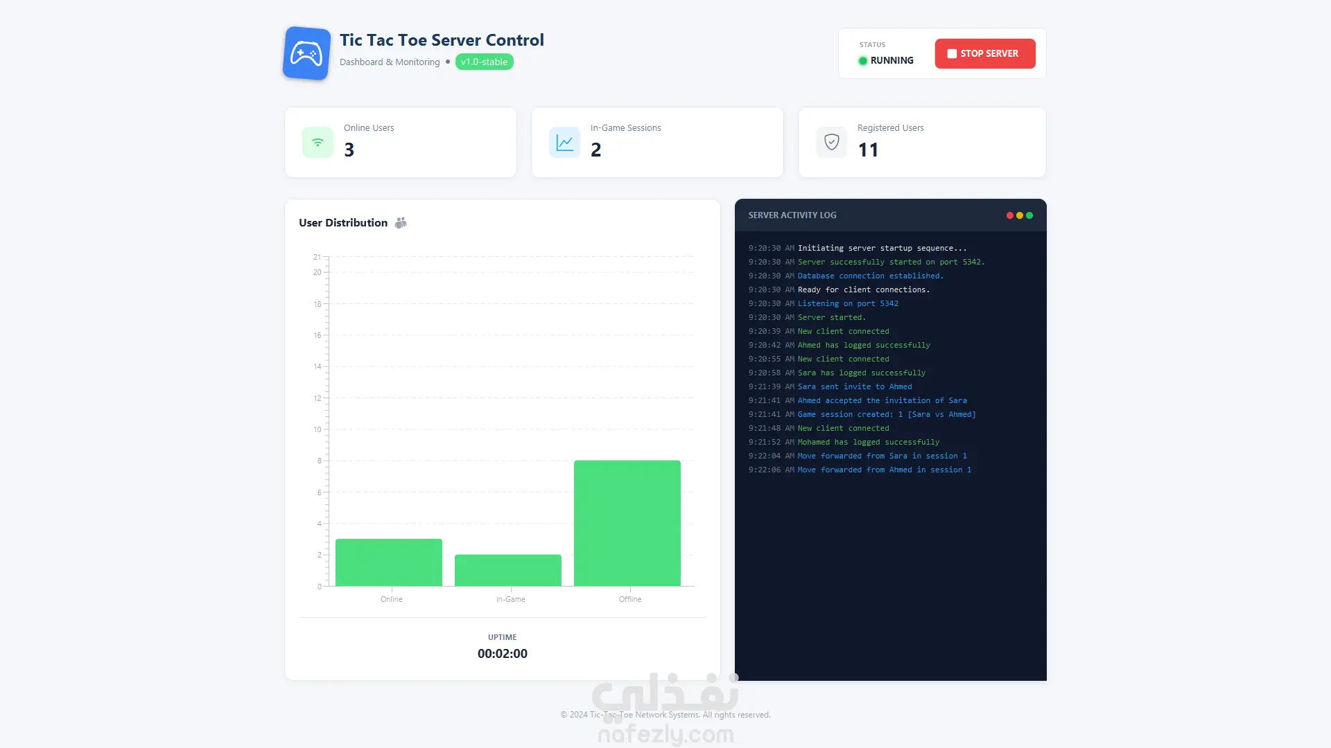 تطبيق Tic Tac Toe Client هو تطبيق سطح مكتب تم تطويره باستخدام JavaFX، يتيح للمستخدمين لعب لعبة إكس-أو (Tic Tac Toe) بعدة أوضاع تشمل اللعب أونلاين مع لاعبين آخرين، اللعب المحلي، أو اللعب الفردي ضد الكمبيوتر. يتصل التطبيق بخادم Tic Tac Toe Server لتمكين اللعب عبر الإنترنت، إدارة المصادقة، والتفاعل بين اللاعبين. دوري في المشروع: عملت كجزء من فريق تطوير التطبيق، مسؤول عن: تطوير واجهات المستخدم باستخدام JavaFX إدارة الاتصال مع الخادم عبر Socket Programming (TCP) تنفيذ Multithreading لتزامن الرسائل والألعاب تصميم وتنفيذ MVC Architecture دمج الرسوميات والصوتيات والحركات داخل اللعبة تسجيل تاريخ الألعاب وإعادة التشغيل الميزات الرئيسية لتطبيق العميل تسجيل المستخدم وتسجيل الدخول اللعب أونلاين مع لاعبين آخرين وضع اللعب المحلي بين شخصين على نفس الجهاز اللعب الفردي ضد الكمبيوتر نظام دعوات للعب وقبول/رفض الدعوات واجهة مستخدم أنيقة باستخدام JavaFX تسجيل تاريخ الألعاب وإمكانية إعادة اللعب متابعة نقاط اللاعبين مؤثرات صوتية وحركات ورسوميات عند الفوز التقنيات المستخدمة: Java SE JavaFX Socket Programming (TCP) Multithreading MVC Architecture FXML لتصميم الواجهة Gson / JSON لتبادل الرسائل أوضاع اللعبة: لاعب واحد ضد الكمبيوتر لاعبان على نفس الجهاز (اللعب المحلي) لاعبان عبر الإنترنت (متصل بالخادم) نظرة عامة على تطبيق الخادم: تطبيق Tic Tac Toe Server هو خادم Java مسؤول عن: إدارة اتصالات العملاء التعامل مع منطق اللعبة إدارة المصادقة والتسجيل تنسيق مباريات اللعب أونلاين بين اللاعبين يعمل الخادم كمركز رئيسي لتوجيه الرسائل، دعوات اللعبة، وإدارة اللاعبين. الميزات الرئيسية لتطبيق الخادم: دعم اتصالات متعددة مع العملاء في نفس الوقت تسجيل المستخدمين والمصادقة إدارة اللاعبين المتصلين أونلاين التعامل مع دعوات اللعبة (قبول/رفض) توجيه الرسائل بين العملاء تنسيق الألعاب من جهة الخادم واجهة GUI بسيطة لمراقبة الخادم باستخدام JavaFX وظائف تشغيل وإيقاف الخادم هندسة قابلة للتوسع أعضاء الفريق تم تطوير المشروع بواسطة: علاء عادل أحمد إياد وليد عبد الفتاح محمود محمد بيومي محمد أمير محمد