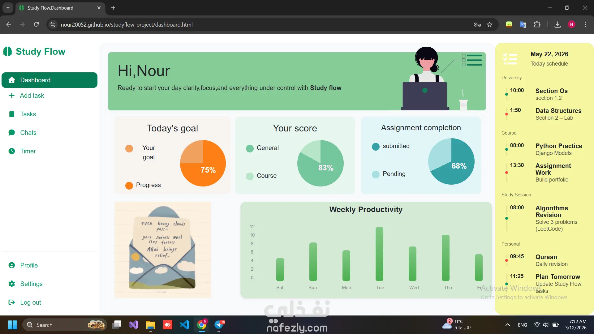 هو تطبيق ويب يساعد المستخدمين على تنظيم مهامهم اليومية وإدارة وقتهم بكفاءة. يتيح للمستخدم إضافة المهام، تحديد الأولويات، متابعة التقدم، ومراقبة مستوى الإنجاز من خلال واجهة تفاعلية وسهلة الاستخدام. يهدف المشروع إلى تحسين الإنتاجية وتنظيم العمل أو الدراسة بطريقة أكثر وضوحًا. تم تطوير المشروع باستخدام تقنيات HTML، CSS، JavaScript، وBootstrap لإنشاء واجهة مستخدم متجاوبة وسلسة تعمل على مختلف الأجهزة. كما تم التركيز على تصميم تجربة مستخدم مريحة مع عناصر تفاعلية مثل الـ Progress Indicators، التايمر لإدارة وقت المذاكرة، ولوحة تحكم (Dashboard) لعرض البيانات بشكل منظم.