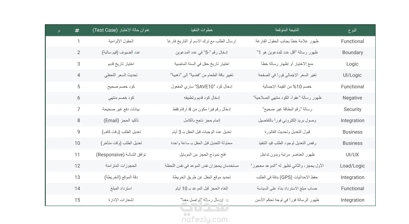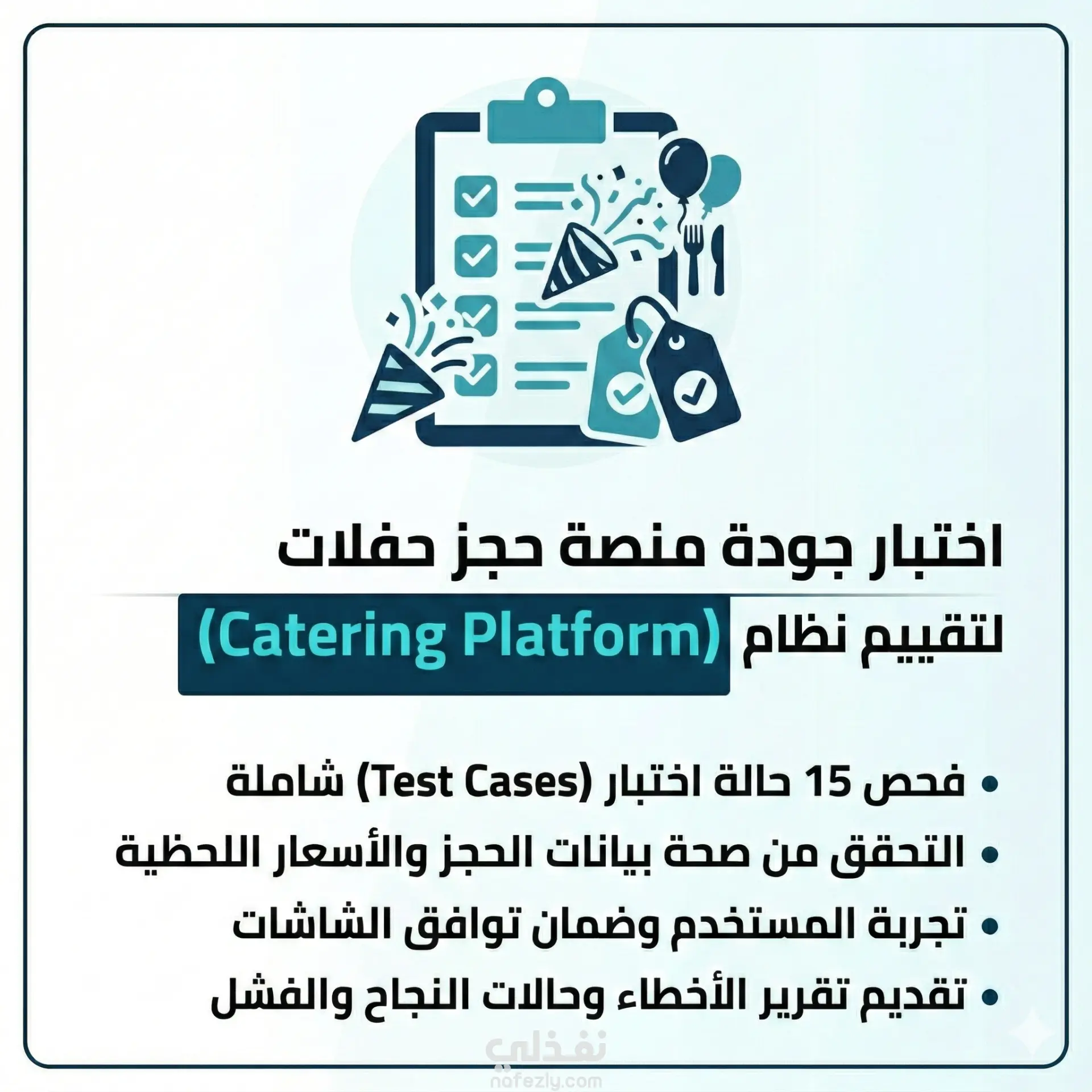 "قمت بإعداد وتنفيذ خطة اختبار (Test Plan) متكاملة لمنصة حجز حفلات (Catering). ركزت في هذا المشروع على ضمان صحة العمليات المعقدة وحماية بيانات المستخدمين. شمل العمل: كتابة وتنفيذ 15 حالة اختبار (Test Cases) تغطي سيناريوهات النجاح والفشل، والـ Edge Cases. التحقق الدقيق من حقول الإدخال (عدد الضيوف، التواريخ) والقيود المنطقية (Business Rules). فحص منطق حساب الأسعار وتطبيق أكواد الخصم بشكل صحيح. اختبار تجربة المستخدم (UX) وتوافق المنصة مع مختلف الشاشات (Responsiveness). ضمان استقرار النظام وتقديم تقارير واضحة بالحالات والأخطاء المكتشفة."