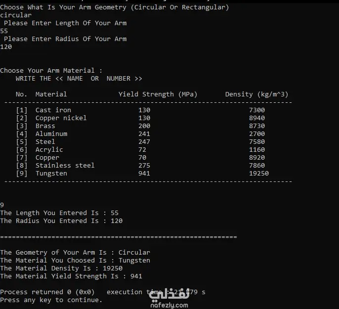 برنامج يساعدك على اختيار مقاسات و نوع المادة الذي ستصنع بها الذراع الاليه بالاضافة الي اختيار انواع المواتير المناسبة