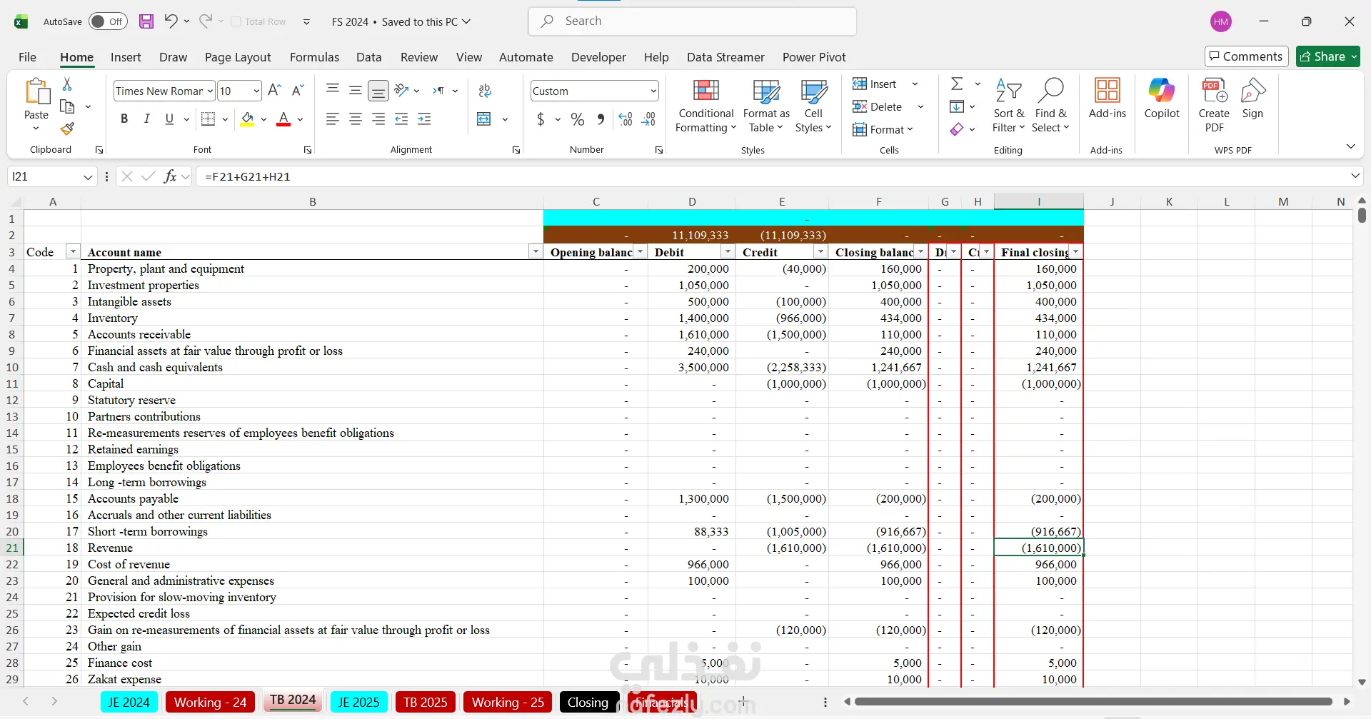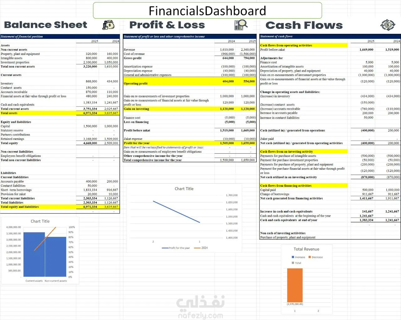 إعداد القوائم المالية (قائمة الدخل – الميزانية العمومية – التدفقات النقدية) لعامي 2024 و2025