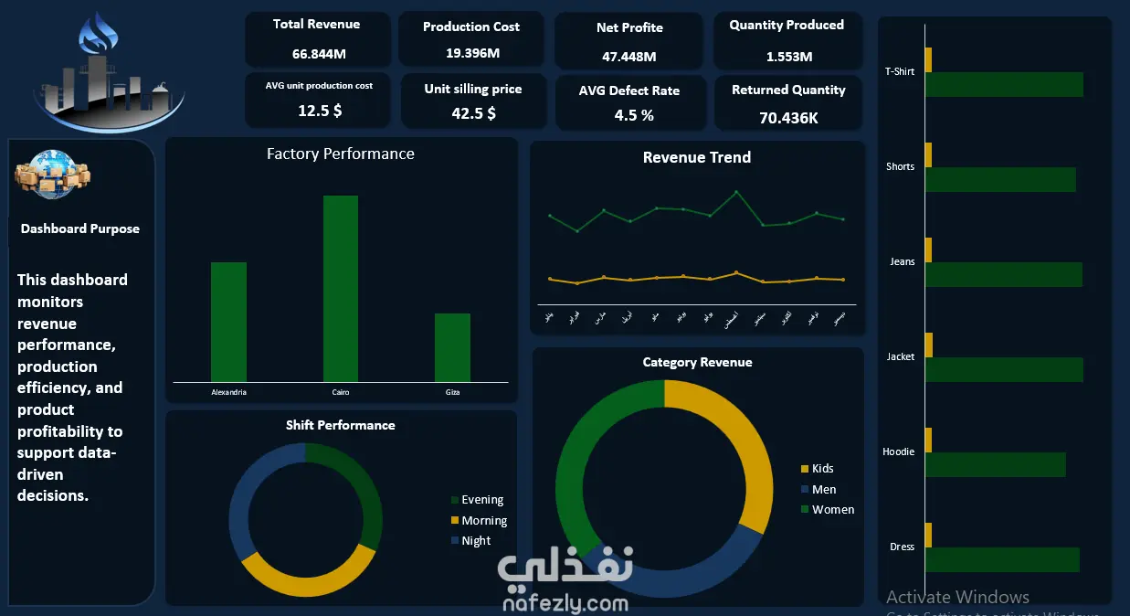 The dashboard provides clear insights into financial performance, product profitability, defect rates, and production shifts to support data-driven decision-making.