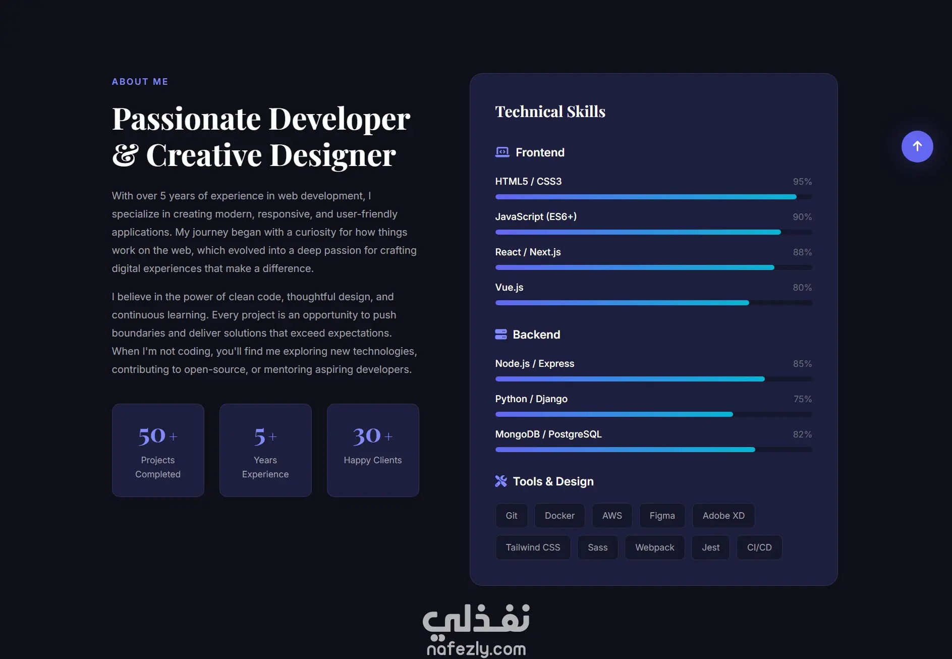 قمت بتطوير موقع Portfolio احترافي بالكامل لعرض الأعمال والخدمات بشكل عصري وجذاب. يعتمد الموقع على تصميم حديث مع تجربة مستخدم سلسة وتفاعلية، مع التركيز على الأداء وسهولة التخصيص. تم بناء المشروع باستخدام HTML وCSS وJavaScript ، مع كود نظيف ومنظم وفق أفضل ممارسات تطوير الواجهات الأمامية. الموقع مصمم بتصميم Dark Theme حديث مع تأثيرات حركية تضيف طابعًا احترافيًا للتجربة. الصفحة متجاوبة تمامًا وتعمل بكفاءة على جميع الأجهزة من موبايل، تابلت، وكمبيوتر. يتضمن الموقع أقسام جذابة: Hero Section مع صورة شخصية وعناصر متحركة Projects Section لعرض المشاريع بطريقة احترافية About Section مع مهارات ومؤشرات تقدم تفاعلية Contact Section مع نموذج تواصل فعال Footer يحتوي على روابط السوشيال ميديا والتنقل داخل الموقع تمت إضافة تفاعلات ديناميكية باستخدام JavaScript تشمل: قائمة تنقل متجاوبة للموبايل (Hamburger Menu) تنقل سلس بين الأقسام (Smooth Scrolling) Scroll-triggered Animations باستخدام Intersection Observer Animated Skill Progress Bars Animated Statistics Counters Form Validation مباشر باستخدام JavaScript زر Scroll To Top ديناميكي تمييز الرابط النشط في شريط التنقل الموقع يستخدم: HTML5 (Semantic Structure)، CSS3 (Flexbox & Grid)، CSS Variables، Font Awesome Icons، Google Fonts. تم الاهتمام بكل التفاصيل المتعلقة بالتجربة البصرية، سرعة التحميل، وسهولة تعديل الكود لأي مشروع مستقبلي. الموقع جاهز للعرض مباشرة للعميل أو للاستخدام الشخصي بدون أي Dependencies أو Build Process.