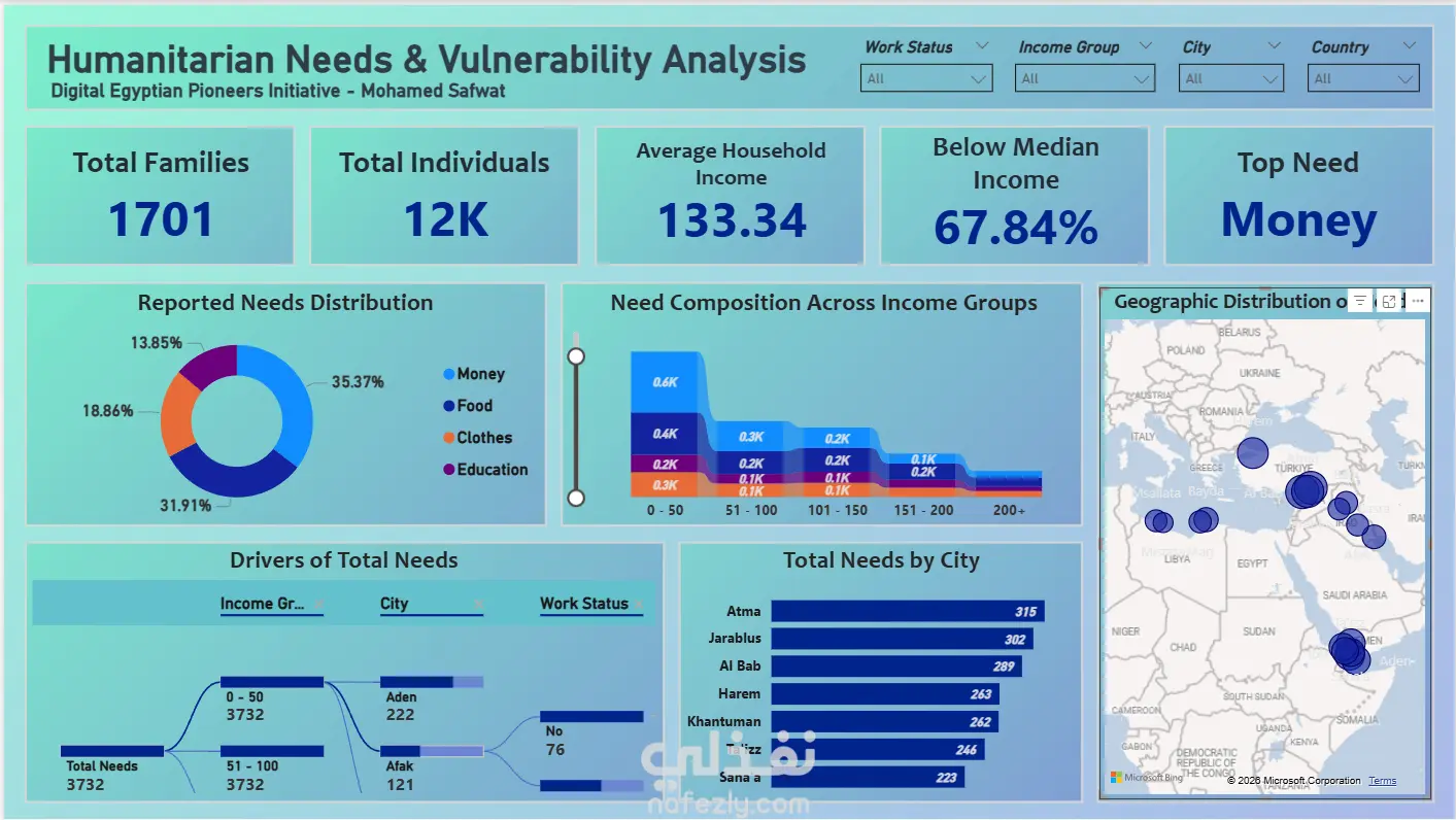 تم تصميم Dashboard لدعم المنظمات الإنسانية في تحديد الأولويات وتوجيه الموارد بشكل أكثر كفاءة بناءً على البيانات.
