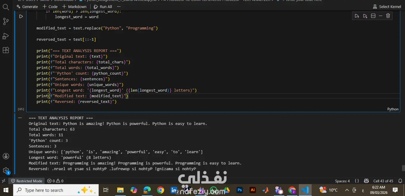 قمت ببرمجة وتطوير أداة "محلل النصوص" (Text Analyzer) باستخدام لغة بايثون (Python). يهدف هذا السكربت إلى استقبال أي نص، القيام بمعالجته وتفكيكه برمجياً، ثم إصدار تقرير شامل ودقيق يحتوي على إحصائيات تفصيلية حول مكونات هذا النص. هذا النوع من السكربتات يُعد خطوة أساسية في مجالات تنظيف البيانات (Data Cleaning) ومعالجة اللغات الطبيعية (NLP). المهام التي تقوم بها الأداة: التحليل الإحصائي: حساب إجمالي عدد الأحرف والكلمات بدقة. تحليل الجمل: التعرف الذكي على نهايات الجمل (من خلال علامات الترقيم مثل . و ! و ?) لحساب عددها. البحث المخصص: إيجاد وحساب معدل تكرار كلمات مفتاحية محددة داخل النص (Keyword Frequency). فلتره البيانات (Data Filtering): تنظيف النص من علامات الترقيم، توحيد حالة الأحرف (Lowercase)، واستخراج قائمة بالكلمات الفريدة (Unique Words) بدون أي تكرار. الخوارزميات البسيطة: البحث آلياً عن "أطول كلمة" داخل النص وحساب عدد أحرفها. تعديل النصوص: استبدال كلمات معينة بكلمات أخرى ديناميكياً وإنشاء نسخة جديدة من النص. التقطيع (Slicing): عكس النص بالكامل من الحرف الأخير للأول. التقنيات والمهارات المستخدمة في الكود: لغة البرمجة: Python معالجة النصوص (String Manipulation & Methods). هياكل البيانات الأساسية (Data Structures - Lists). التحكم في مسار البرنامج عبر حلقات التكرار (For Loops) والجمل الشرطية (If Conditions). التنسيق المتقدم للمخرجات باستخدام (f-strings). النتيجة (مخرجات البرنامج): يقوم البرنامج بطباعة تقرير (Report) منسق ومقروء يسهل على المستخدم فهم تفاصيل النص المدخل فوراً، كما هو موضح في الصور المرفقة للمشروع.