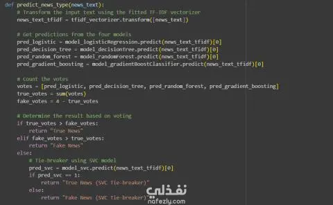 🔹 في هذا المشروع قمت باستخدام مجموعة بيانات قوية تضم حوالي 44,000 مقال إخباري مصنّف إلى أخبار صحيحة وأخبار زائفة، بهدف تدريب واختبار عدة نماذج من خوارزميات التعلم الآلي. 🔹 بدأت بمرحلة معالجة البيانات النصية (Text Preprocessing) ثم تحويل النصوص إلى تمثيل رقمي باستخدام تقنية TF-IDF (Term Frequency–Inverse Document Frequency) لتحويل النص الخام إلى خصائص رقمية يمكن لنماذج التعلم الآلي التعامل معها. 🔹 تم تقييم خمسة نماذج تصنيف على بيانات الاختبار وكانت النتائج كالتالي: Logistic Regression: دقة 99.28% Decision Tree Classifier: دقة 99.54% Random Forest Classifier: دقة 99.16% Gradient Boosting Classifier: دقة 99.51% Support Vector Classifier (SVC): دقة 99.38% 🔹 قمت بمقارنة النماذج من حيث: الدقة (Accuracy)، زمن التنفيذ (Execution Time)، F1-Score، Recall، و Precision. 🔹 الاستنتاجات: نموذج Decision Tree يُعد الخيار الأكثر عملية بفضل دقته العالية وسرعة تنفيذه. نموذج Gradient Boosting يتفوق عندما تكون قيمة الـ Recall (القدرة على اكتشاف جميع الحالات الصحيحة) ذات أولوية. نموذج Logistic Regression يتميز بالبساطة والسرعة والاعتمادية في التطبيقات السريعة. نموذج Random Forest يحقق دقة جيدة لكنه أبطأ نسبيًا، لذلك يُفضّل استخدامه في المعالجة غير الفورية (Batch Processing). نموذج SVC يحقق دقة جيدة لكنه يتطلب تكلفة حسابية مرتفعة، مما يجعله أقل ملاءمة للتطبيقات واسعة النطاق أو الزمن الحقيقي. 🎯 في المرحلة النهائية قمت بتطبيق نموذج تجميعي (Ensemble) باستخدام طريقة Hard Voting اعتمادًا على أربعة من أسرع النماذج وهي: (Logistic Regression، Decision Tree، Random Forest، Gradient Boosting). وفي حالة تعادل الأصوات يتم استخدام نموذج SVC كعامل حسم (Tie-Breaker) نظرًا لدقته، مع استخدامه بشكل محدود بسبب زمن التنبؤ الأطول. يسلط هذا المشروع الضوء على قدرة طرق التجميع (Ensemble Methods) على رفع مستوى الدقة وتحقيق توازن بين الأداء والكفاءة الحسابية.