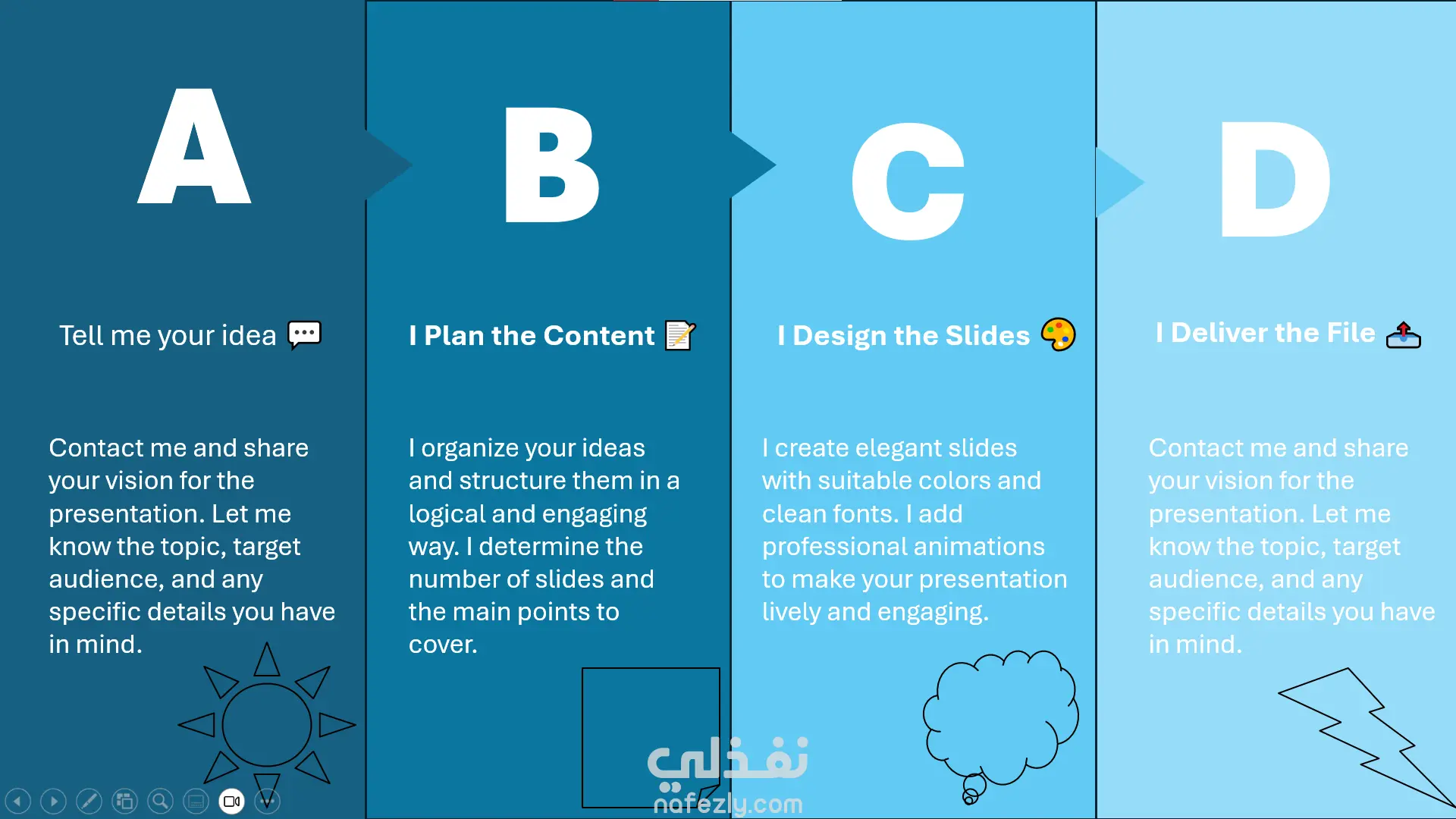 أقوم بتصميم عروض تقديمية احترافية باستخدام برنامج PowerPoint تناسب العروض التجارية، التسويقية، والتعليمية. تتضمن هذه النماذج أنواعًا مختلفة من الشرائح مثل: عروض تقديمية للمنتجات والعلامات التجارية عرض فكرة أو مشروع (Project Overview) شرائح توضيح الخطوات والعمليات بشكل إنفوجرافيك شرائح تسويقية وإعلانية جذابة أركز في تصميماتي على: تنظيم المحتوى بشكل واضح وسهل الفهم تصميم احترافي وألوان متناسقة استخدام عناصر بصرية جذابة تساعد على إيصال الفكرة بوضوح تقديم عرض بسيط ومنظم يجذب انتباه الجمهور