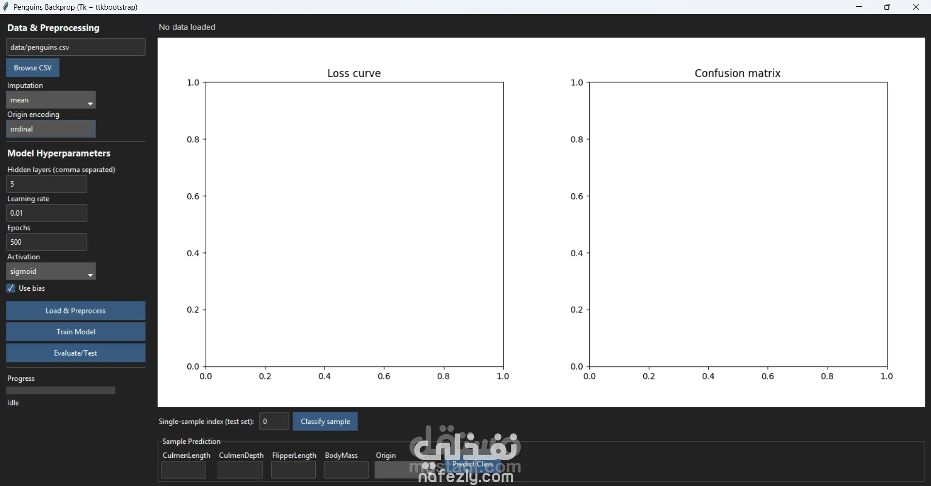 هذا المشروع هو تطبيق متكامل لتعلم الآلة يقوم ببناء شبكة عصبية متعددة الطبقات (Multi-Layer Neural Network) من الصفر يقوم النظام بتصنيف أنواع البطريق بناءً على القياسات الفيزيائية مثل: طول المنقار عمق المنقار طول الزعنفة كتلة الجسم موقع المنشأ يتضمن المشروع: تحميل البيانات ومعالجتها المسبقة (تنظيف، تعويض القيم الناقصة، الترميز، والتقييس) تنفيذ خوارزمية الانتشار الأمامي والانتشار العكسي يدويًا إمكانية تخصيص بنية الشبكة العصبية (عدد الطبقات المخفية، دوال التفعيل، معدل التعلم، استخدام الانحياز) عرض مباشر لمنحنى الخطأ أثناء التدريب تقييم النموذج باستخدام مصفوفة الالتباس ودقة التصنيف واجهة رسومية تفاعلية باستخدام Tkinter و ttkbootstrap إمكانية إدخال عينة جديدة يدويًا والتنبؤ بفئتها