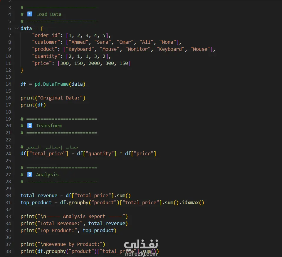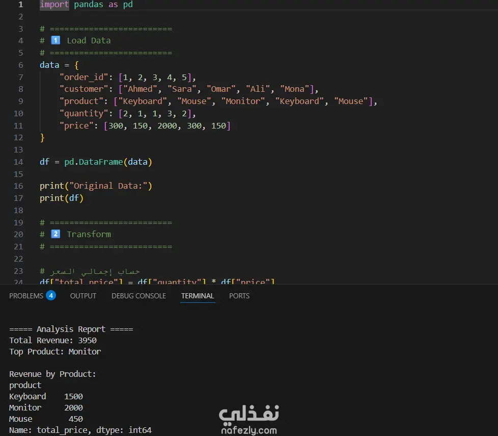 قمت بتنفيذ مشروع لتنظيف وتحليل البيانات باستخدام لغة Python ومكتبة Pandas يقوم المشروع بتحويل بيانات المبيعات الخام، حساب الإيرادات، واستخراج تحليلات ورؤى تساعد في اتخاذ القرارات.