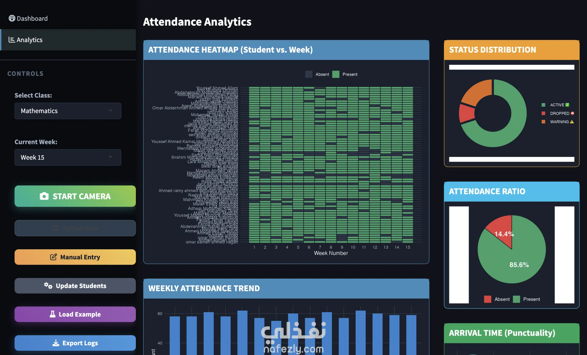 تطوير نظام حضور تلقائي يعتمد على التعرف على الوجوه؛ عند تشغيل الكاميرا يتم التعرف على الطلاب وتسجيل حضورهم مباشرة دون تدخل يدوي. تسجيل بيانات الحضور تلقائيًا مثل اسم الطالب، تاريخ المحاضرة، ووقت الوصول داخل قاعدة بيانات منظمة. إنشاء لوحة معلومات (Dashboard) تحتوي على رسوم بيانية و-Visualizations لعرض نسب الحضور والغياب وأنماط المشاركة. إجراء تحليل إحصائي لبيانات الحضور لاكتشاف الاتجاهات ومتابعة التزام الطلاب بالمحاضرات. توفير إمكانية تصدير بيانات الحضور بصيغة CSV لاستخدامها في التقارير أو التحليل الإضافي. المساهمة في تقليل الأخطاء البشرية وتحسين كفاءة إدارة الحضور مقارنة بالطرق التقليدية.