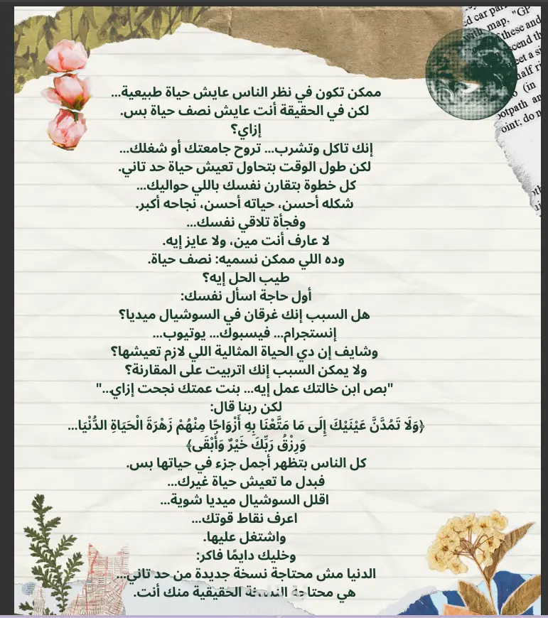 مقال يتناول فكرة المقارنة مع الآخرين وكيف قد تجعل الإنسان يعيش نصف حياته فقط، بينما يضيع النصف الآخر في محاولة تقليد حياة غيره، مع دعوة للتصالح مع الذات وتقدير الحياة الخاصة.