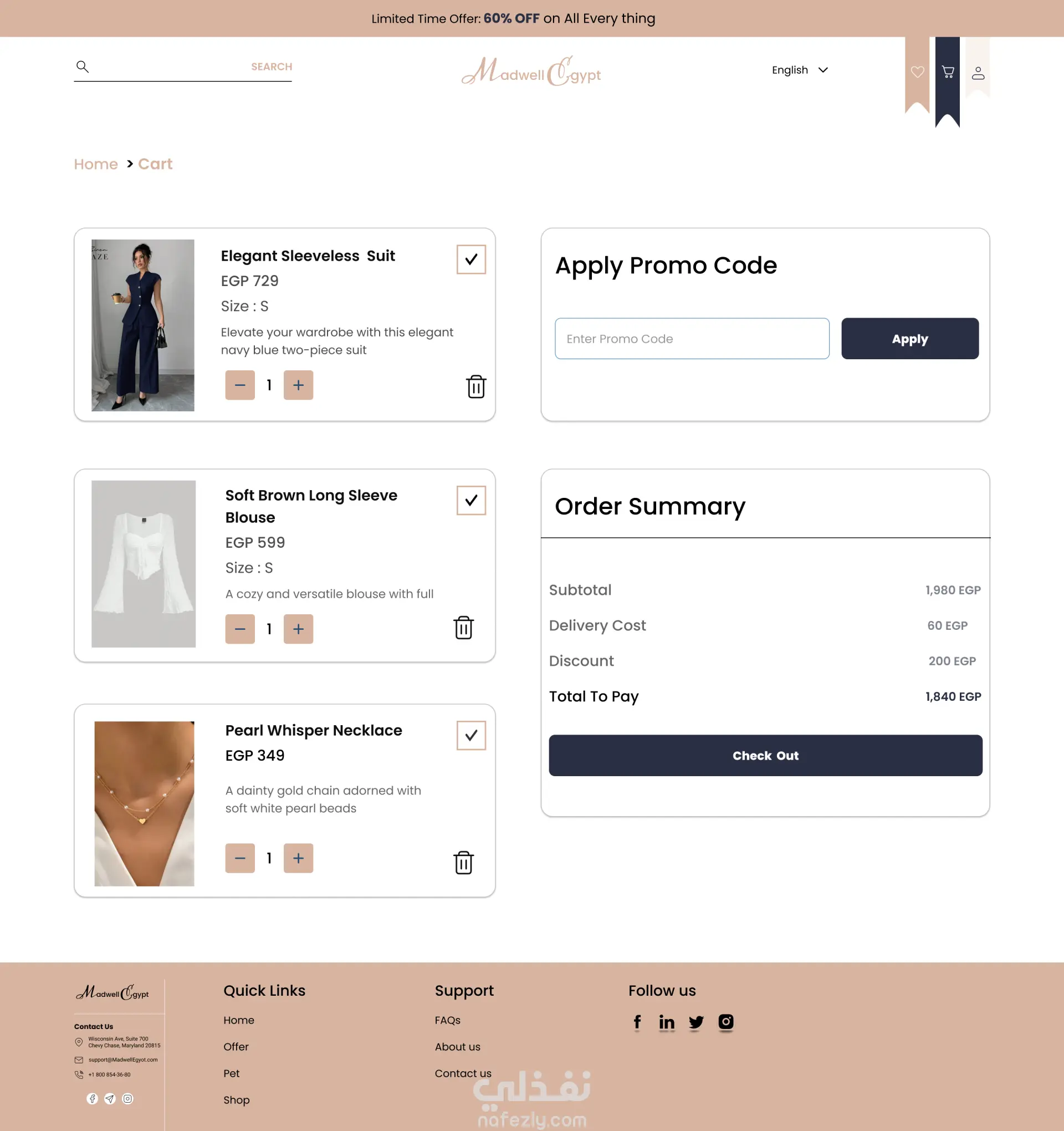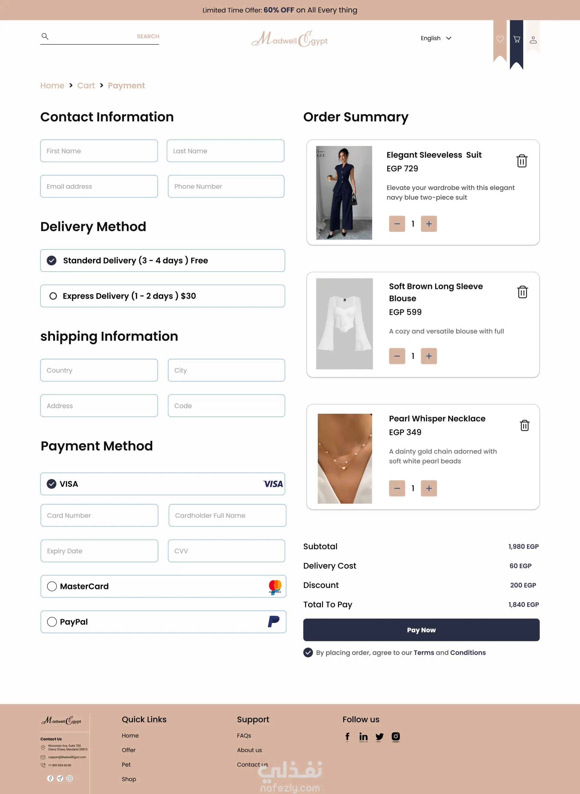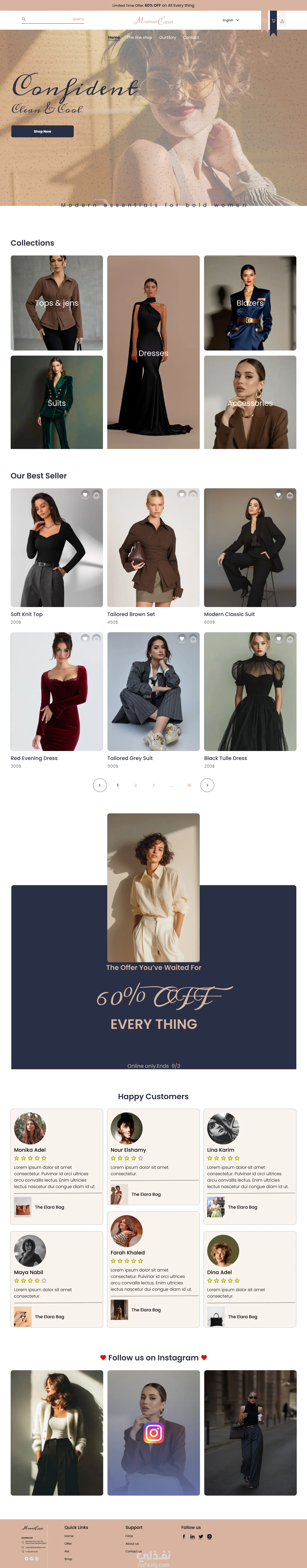 الهدف من المشروع كان تصميم واجهة متجر إلكتروني حديث وسهل الاستخدام يعرض المنتجات بشكل منظم ويُسهّل رحلة الشراء، مع التركيز على تحسين تجربة المستخدم وزيادة معدل إتمام الطلبات. كان التحدي الأساسي هو: تنظيم عدد كبير من المنتجات بشكل واضح بدون تشتيت بصري تبسيط خطوات الشراء لتقليل احتمالية ترك السلة تحقيق توازن بين الشكل العصري وسهولة التنفيذ برمجيًا قمت بتصميم تجربة مستخدم تعتمد على: تسلسل بصري واضح يوجه المستخدم خطوة بخطوة إبراز أزرار الشراء والدعوة لاتخاذ إجراء (CTA) بشكل استراتيجي تقسيم المحتوى بطريقة تسهل التصفح تصميم صفحات نظيفة Minimal مع الحفاظ على هوية بصرية متناسقة الصفحات المصممة (نسخة سطح المكتب) الصفحة الرئيسية (Home) صفحة عرض المنتجات (Shop / Category) صفحة تفاصيل المنتج سلة المشتريات (Cart) صفحة إتمام الطلب (Checkout) لأدوات المستخدمة Figma مبادئ UX / UI Grid System لتنظيم العناصر ما سوف يتم تسليمه ملف Figma منظم بالكامل Components قابلة لإعادة الاستخدام تصميم جاهز للتسليم للمطور وسهل التحويل إلى كود النتيجة تصميم احترافي، واضح، وسهل الاستخدام يهدف إلى تحسين تجربة العميل وزيادة فرص إتمام عمليات الشراء.
