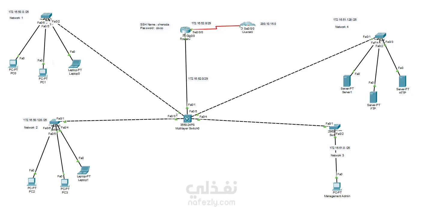 قمت بتصميم وتنفيذ شبكة مؤسسة باستخدام Cisco Packet Tracer مع تطبيق قواعد أمان باستخدام Access Control List (ACL) للتحكم في حركة المرور بين الشبكات المختلفة. يتضمن المشروع: تصميم عدة شبكات فرعية داخل المؤسسة استخدام Multilayer Switch لربط الشبكات المختلفة إعداد Routers لربط الشبكة مع الشبكات الأخرى إعداد Servers لتقديم خدمات مثل HTTP و FTP تطبيق Access Control List للتحكم في الأجهزة المسموح لها بالوصول إلى بعض الخدمات داخل الشبكة اختبار الاتصال بين الأجهزة باستخدام Ping للتأكد من عمل قواعد الأمان بشكل صحيح يهدف المشروع إلى تحسين أمان الشبكة وتنظيم حركة البيانات بين الأجهزة المختلفة.