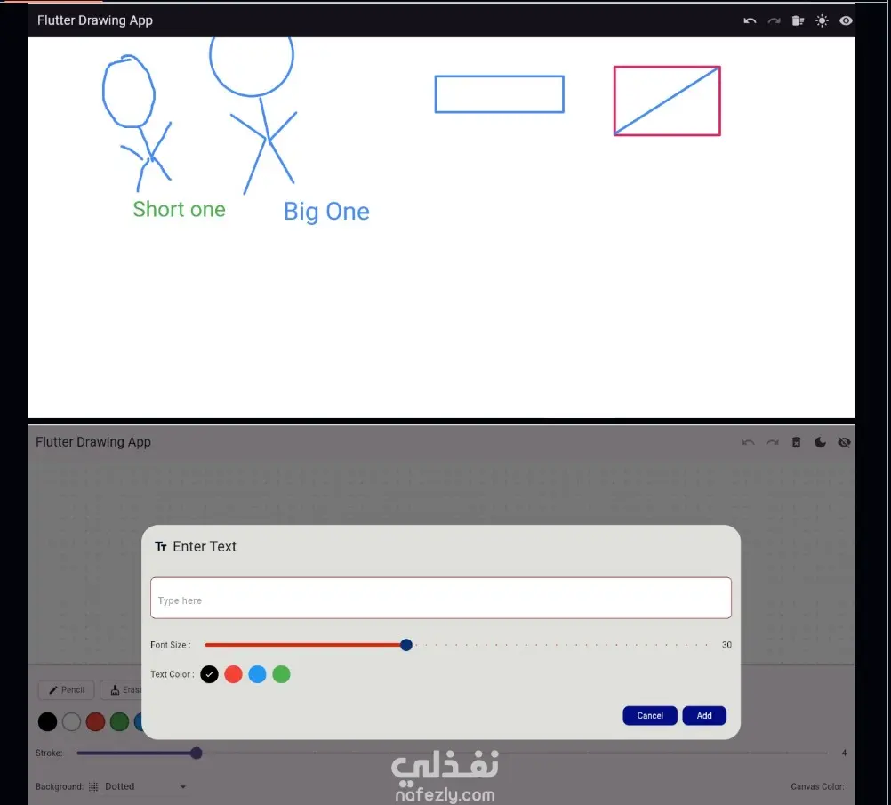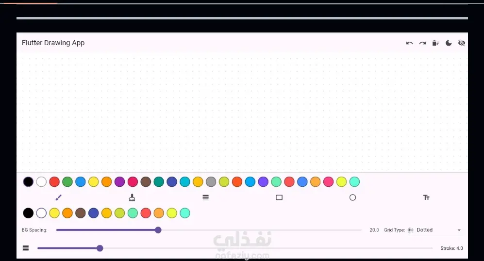 A powerful Flutter drawing app with rich features like freehand drawing, custom stroke width, and background customization (dots, grid, or lines). Supports undo/redo, full clear, and light/dark themes. Add colored text and draw shapes like rectangles, circles, and straight lines Easily change pen and background colors.More features will be added.