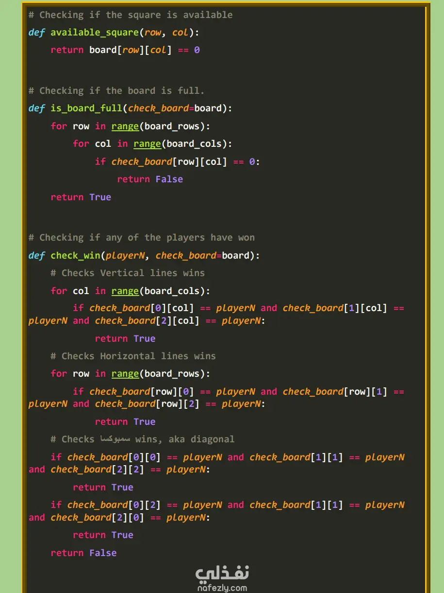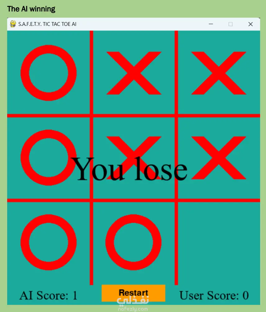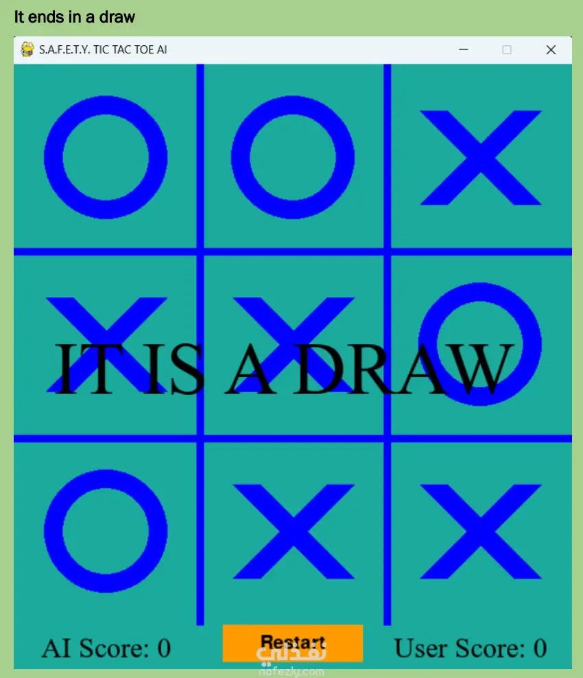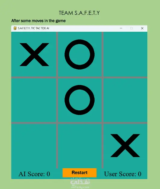 فكرة المشروع: تطوير نظام ذكاء اصطناعي غير قابل للهزيمة للعبة إكس أو، يعتمد بالكامل على خوارزميات الذكاء الاصطناعي دون برمجة مسبقة للحركات. الخوارزمية المستخدمة: يعتمد المشروع على خوارزمية البحث المعروفة باسم Minimax، والتي تضمن قيام الذكاء الاصطناعي دائمًا بأفضل حركة ممكنة من خلال استكشاف جميع الاحتمالات المتاحة للحركات المستقبلية. المميزات التقنية للذكاء الاصطناعي: بناء شجرة لعب تمثل جميع الحالات المستقبلية الممكنة للوحة اللعبة، وتقييم كل حالة على أنها فوز أو خسارة أو تعادل. اختيار الحركة التي تحقق أفضل نتيجة ممكنة للذكاء الاصطناعي مع تقليل فرص الخصم إلى أدنى حد. تحقيق قرارات مثالية مضمونة مع استهلاك منخفض للموارد البرمجية. مكونات النظام البرمجي: واجهة المستخدم الرسومية: تم استخدام مكتبة Pygame لتصميم نافذة اللعبة، وتحديد الألوان والخطوط، وإضافة عناصر التحكم مثل زر إعادة التشغيل. إدارة اللوحة: تم استخدام مكتبة NumPy لتمثيل لوحة اللعبة (3×3) وإدارة المصفوفات والعمليات الحسابية عليها. الأساليب البرمجية: يتضمن النظام مجموعة من الدوال المسؤولة عن رسم خطوط اللوحة، رسم الرموز، التحقق من وجود فائز، وحساب أفضل حركة ممكنة للذكاء الاصطناعي بناءً على تحليل جميع الاحتمالات المتاحة.