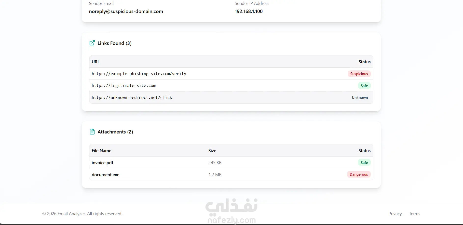 تطوير نظام تحليل أمني للبريد الإلكتروني (Email Analyzer) أقدم خدمة تطوير موقع ويب لتحليل رسائل البريد الإلكتروني واكتشاف الرسائل المشبوهة أو الاحتيالية. فكرة النظام يمكن للمستخدم: إدخال محتوى البريد أو رفع ملف .eml تحليل الرسالة واستخراج الروابط والمرفقات تحديد مستوى الخطورة (منخفض – متوسط – مرتفع) عرض نسبة احتمالية كون الرسالة Spam المميزات: تسجيل دخول وحماية للمستخدمين تشفير كلمات المرور ونظام JWT فحص الروابط واكتشاف الامتدادات الخطيرة حفظ سجل التحليلات لكل مستخدم واجهة بسيطة وسهلة الاستخدام