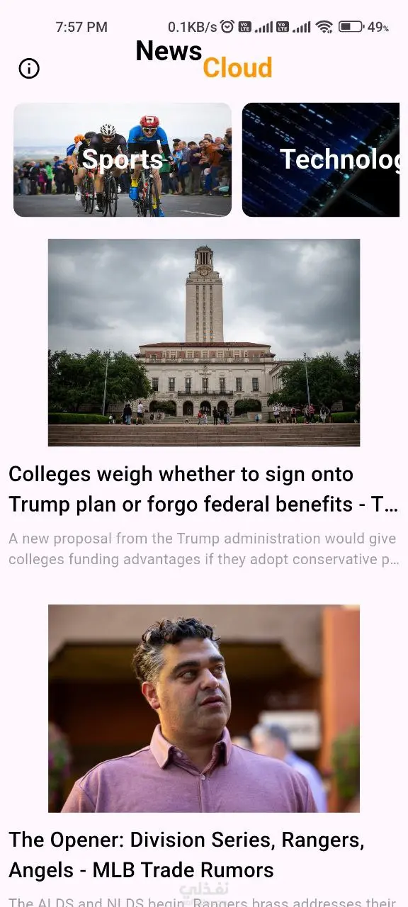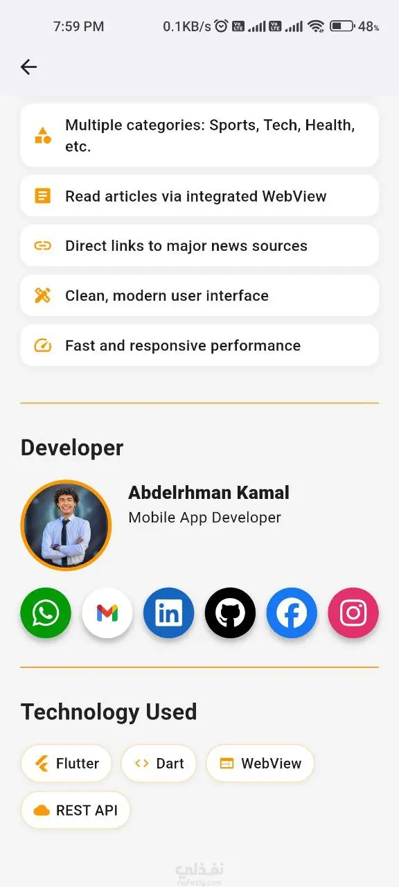 تطبيق أخبار مبني بـ Flutter يجلب أحدث الأخبار من مصادر موثوقة عبر NewsAPI. يدعم التصفية بالتصنيفات (رياضة، تقنية، صحة وغيرها)، مع WebView مدمج لقراءة المقالات كاملةً داخل التطبيق. واجهة سريعة وبسيطة تضمن تجربة مستخدم سلسة.