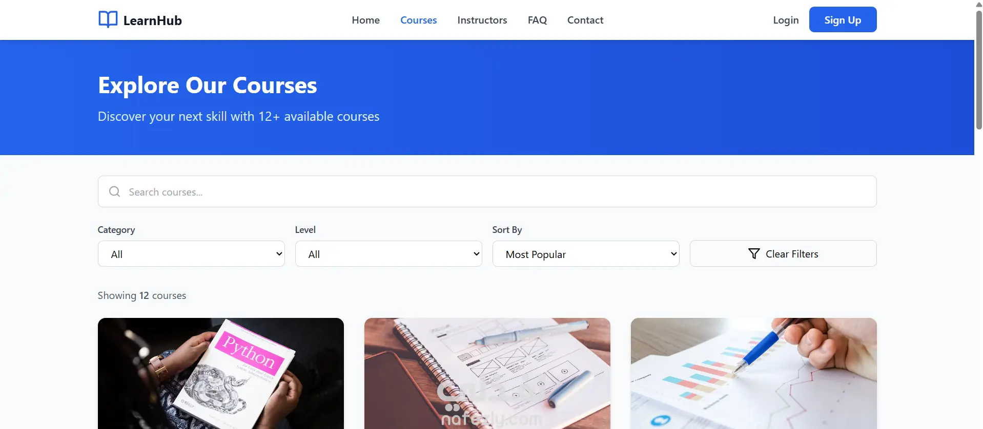 تطوير منصة تعليم إلكتروني احترافية تتيح تصفح الدورات، التسجيل في المنصة، متابعة التقدم الدراسي، وإدارة المحتوى التعليمي. تشمل المنصة صفحات عرض الدورات، تفاصيل الكورس، لوحة تحكم للطلاب، صفحات المدرسين، ونظام تسجيل دخول مع قاعدة بيانات، بتصميم حديث ومتجاوب يعمل على جميع الأجهزة.