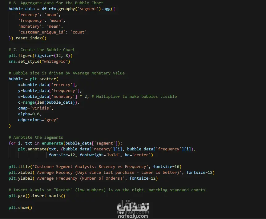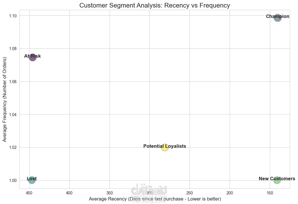 يُستخدم تحليل RFM لمساعدة الشركة العاملة في البرازيل على فهم سلوك عملائها بطريقة بسيطة وواضحة. ويعتمد هذا التحليل على ثلاثة عوامل رئيسية: حداثة الشراء: متى كانت آخر عملية شراء قام بها العميل. تكرار الشراء: عدد مرات الشراء خلال فترة معينة. القيمة المالية: إجمالي ما أنفقه العميل. من خلال هذه العوامل، تستطيع الشركة تقسيم عملائها إلى فئات مختلفة، مثل العملاء الأكثر ولاءً أو العملاء الذين قلّ نشاطهم، مما يساعدها على تحسين التسويق، وتقديم عروض مناسبة لكل فئة، وزيادة رضا العملاء وتحقيق نمو أكبر في الأرباح.
