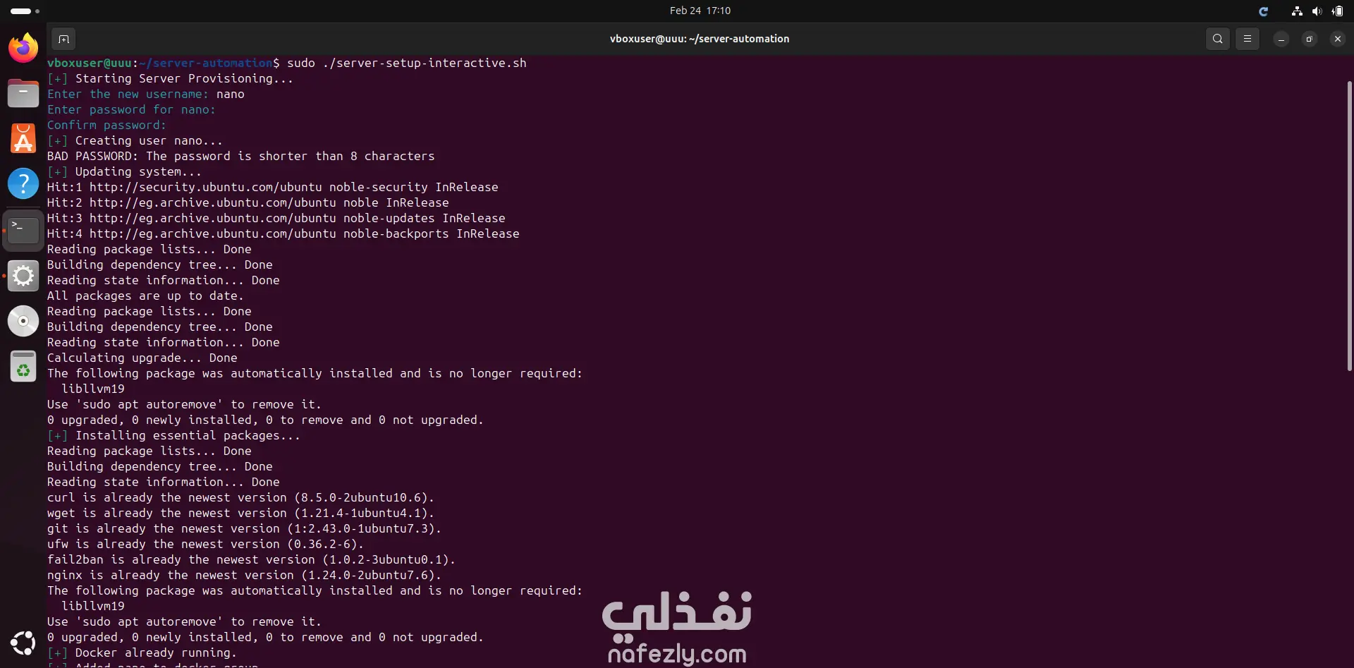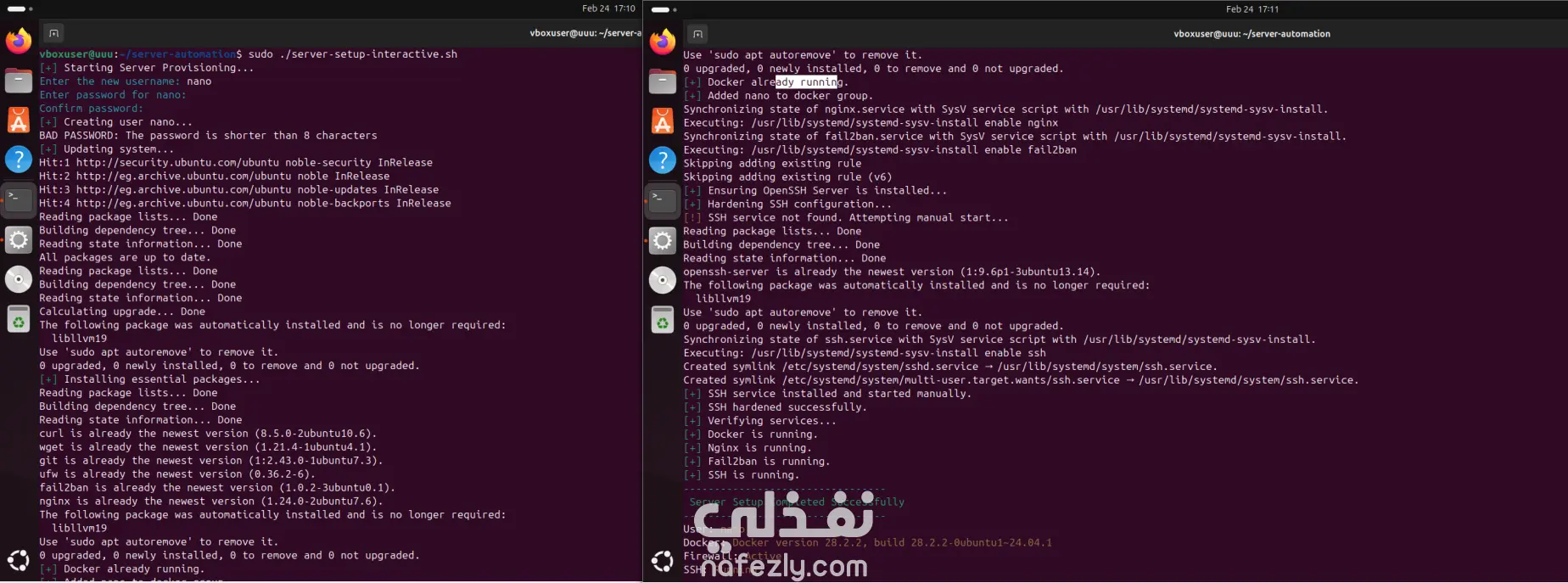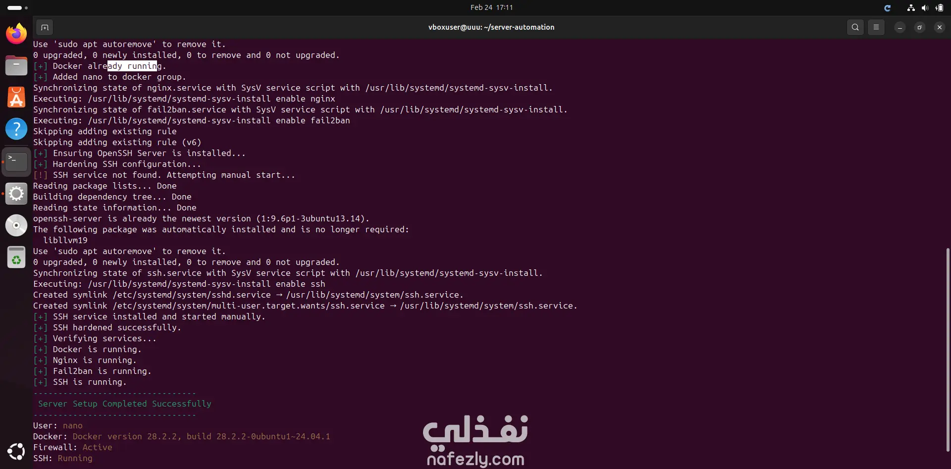Configures Docker, Nginx, Fail2Ban, UFW firewall, and OpenSSH with security hardening and idempotent execution. Designed to simulate real-world DevOps server setup workflows.