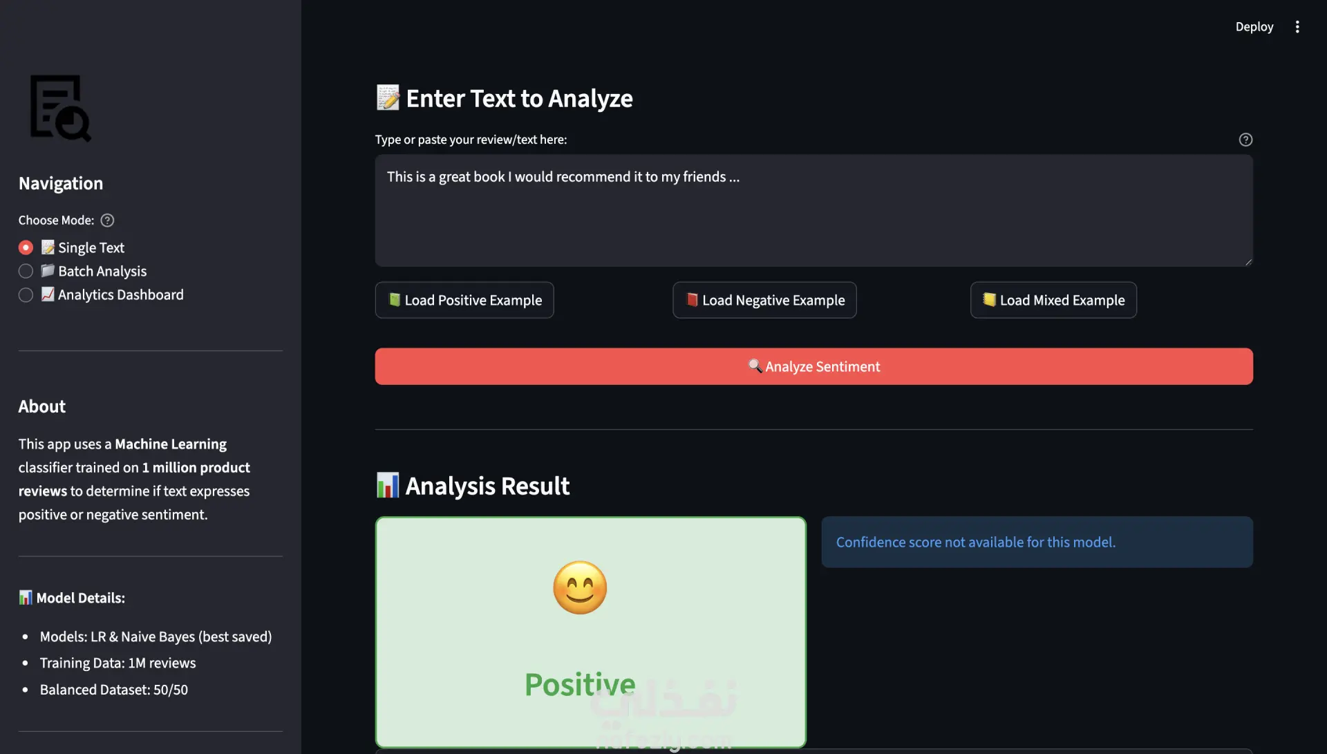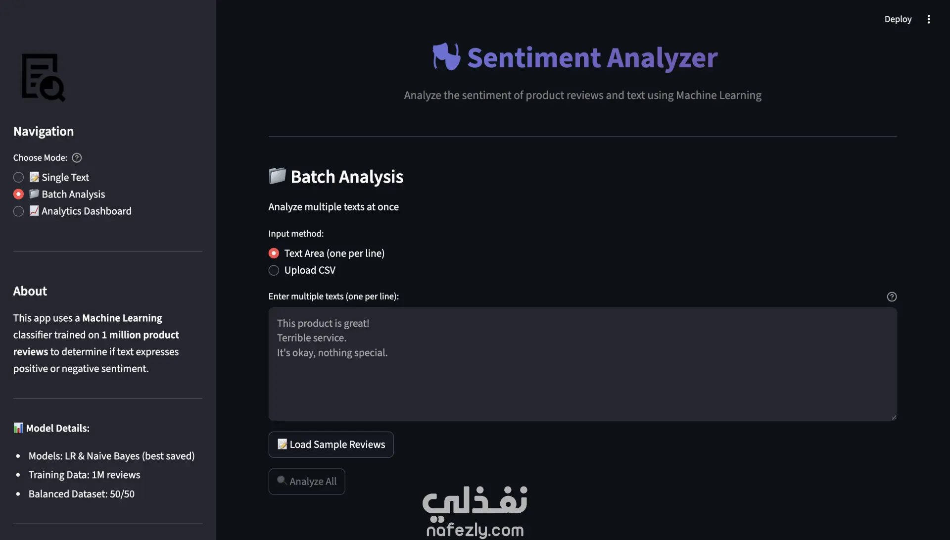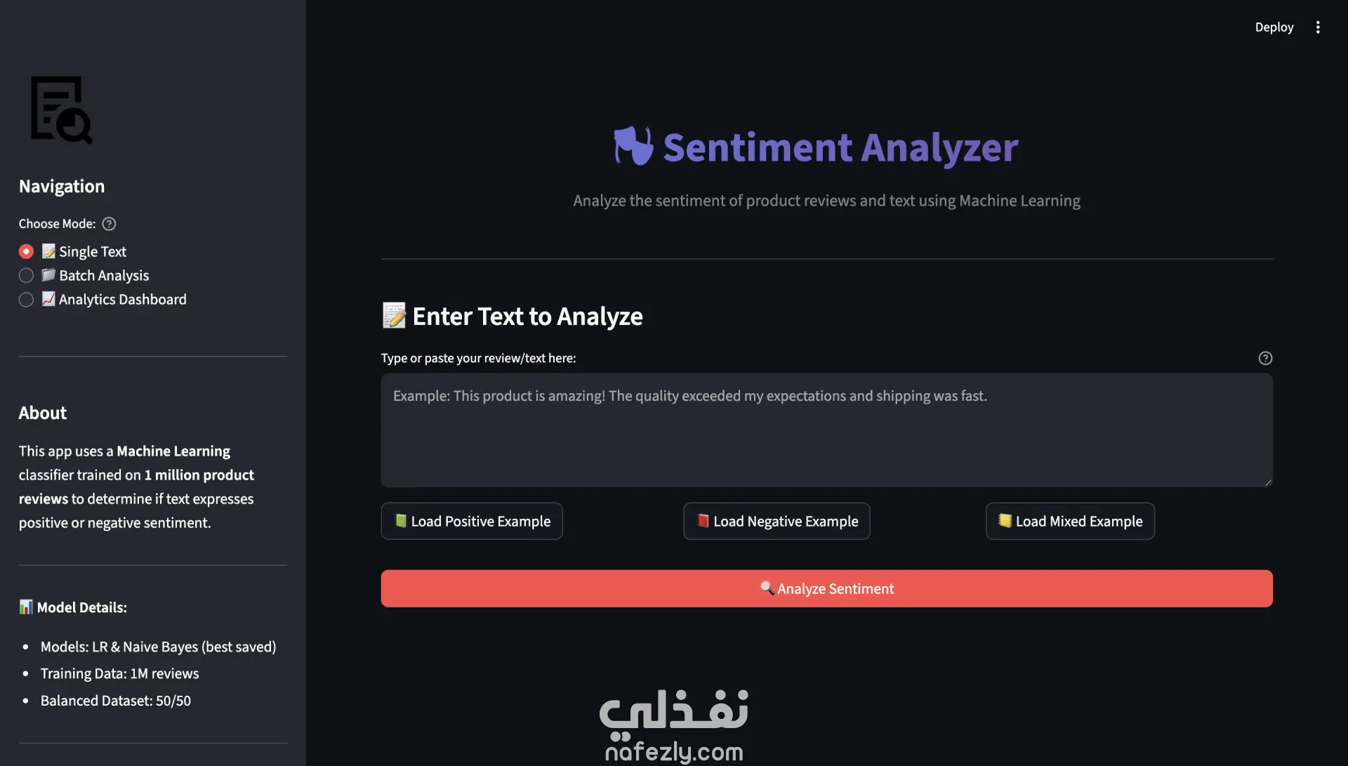 تطبيق ويب تفاعلي يعتمد على تقنيات تعلم الآلة (Machine Learning) ومعالجة اللغات الطبيعية (NLP) لتحليل نصوص تقييمات المنتجات والعملاء، وتصنيفها بدقة إلى آراء إيجابية (Positive) أو سلبية (Negative).